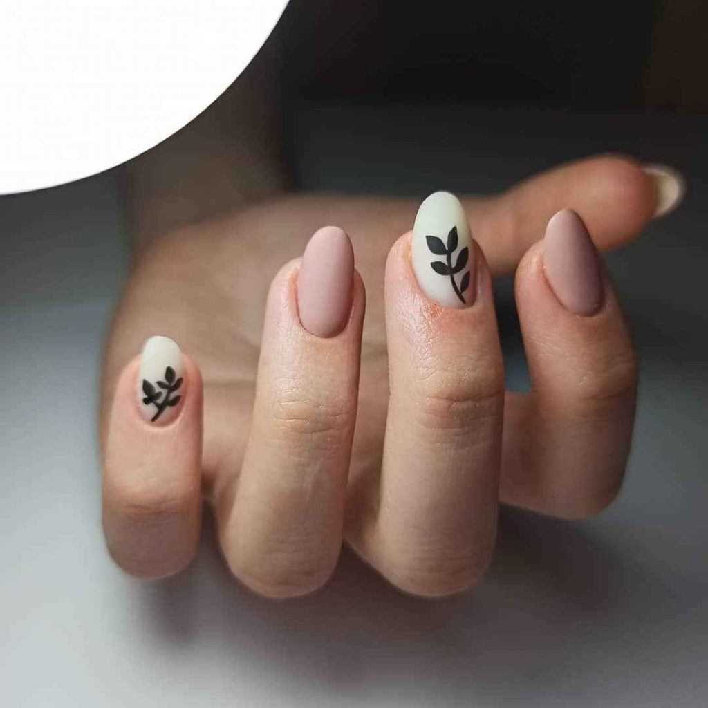 Белый маникюр с бежевым и дизайном из фольги и веточки с листьями в матовом покрытии