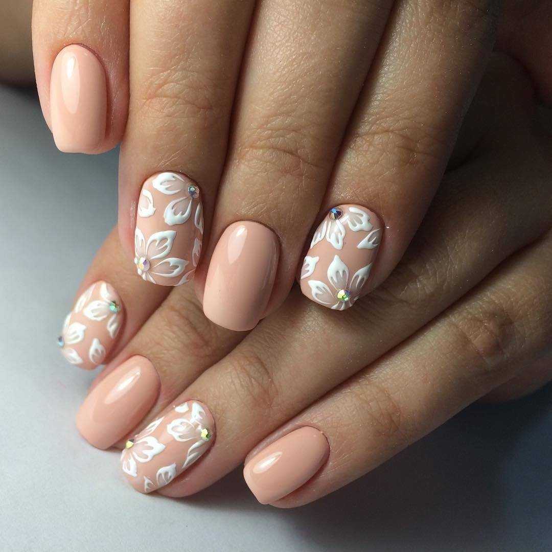 Бежевый маникюр на короткие ногти с цветами на всех пальчиках