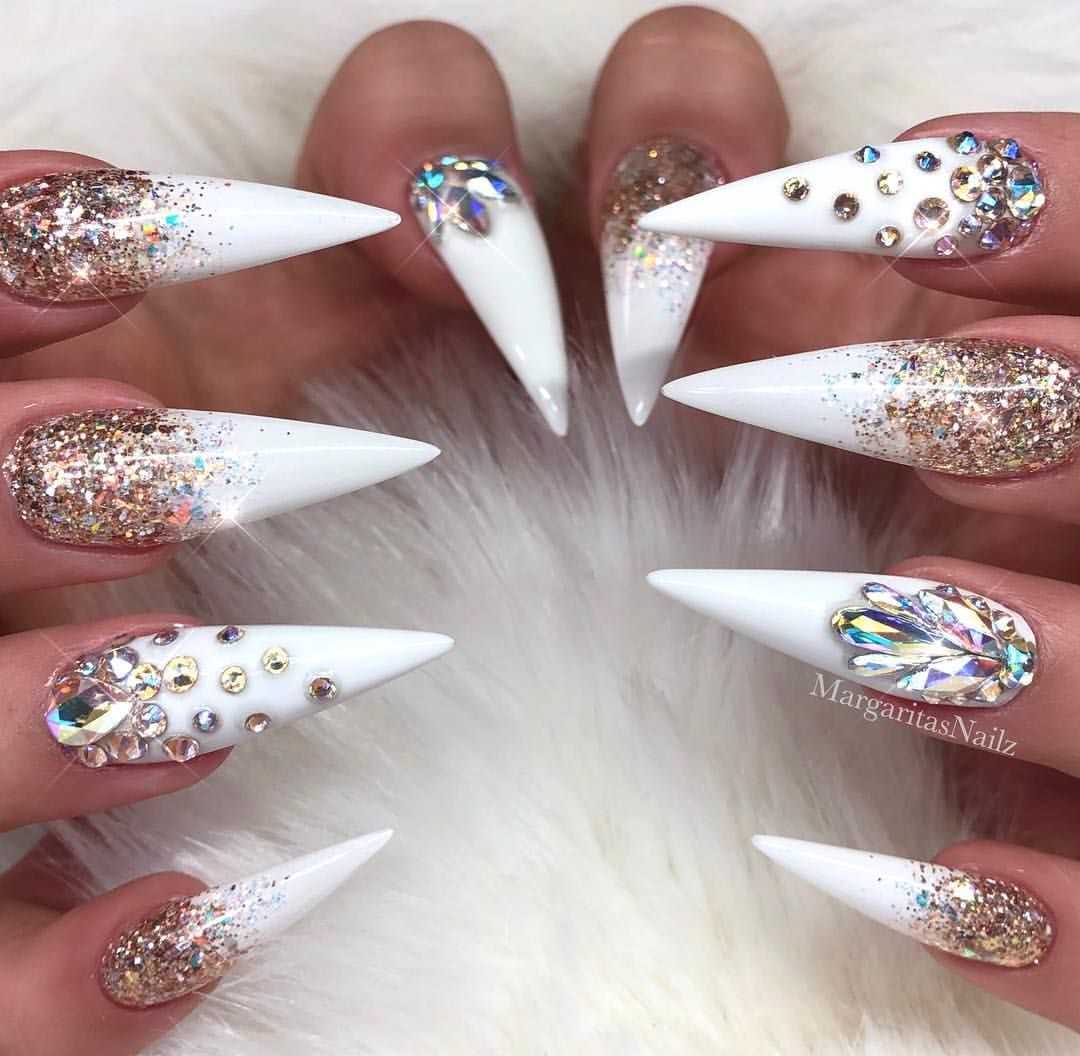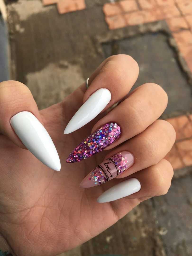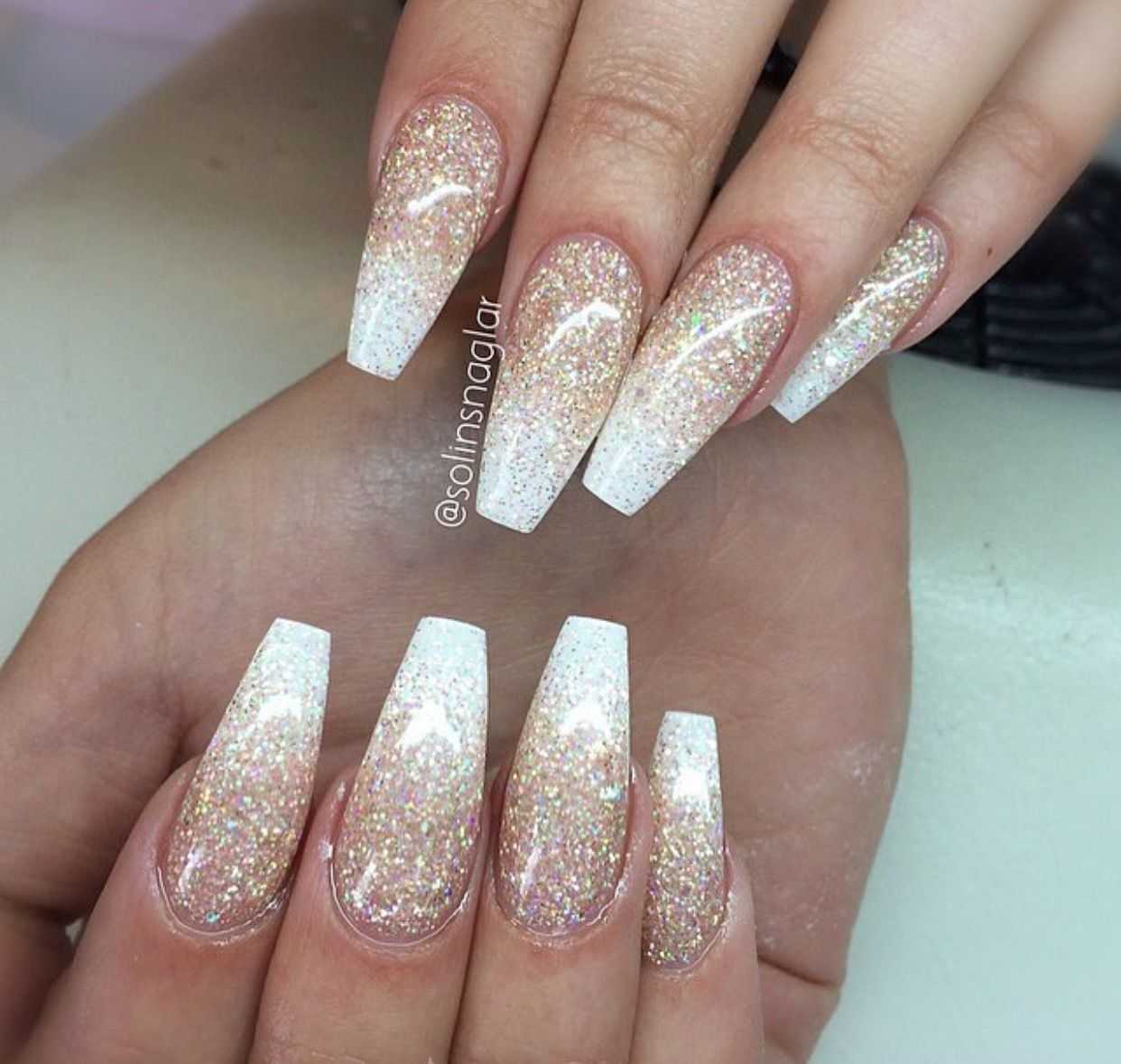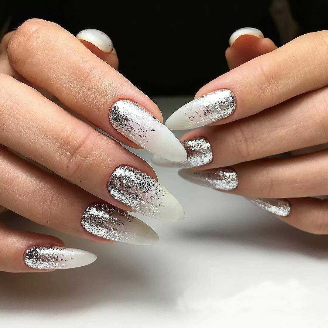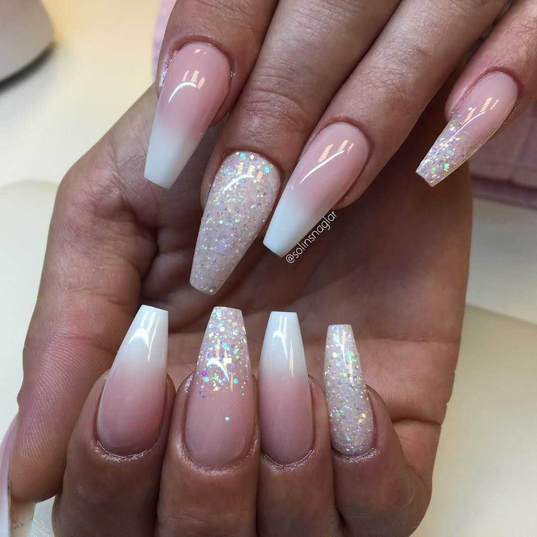 Этот популярный, стильный и красивый прием никогда не утратит своей популярности в сфере нейл-арт индустрии. Известные и модные тенденции делятся на два типа – эффект градиента белого цвета с плавным переходом в блестки, а также растягивание сверкающих блесток на ногтевой пластине, покрытой белым тоном. При этом в любом из вариантов можно использовать блестки разного цвета и формы. Омбре, выполненное при использовании блесток, очень хорошо сочетается с отдельными длинными и острыми ноготками, покрытыми полностью сверкающим декором.