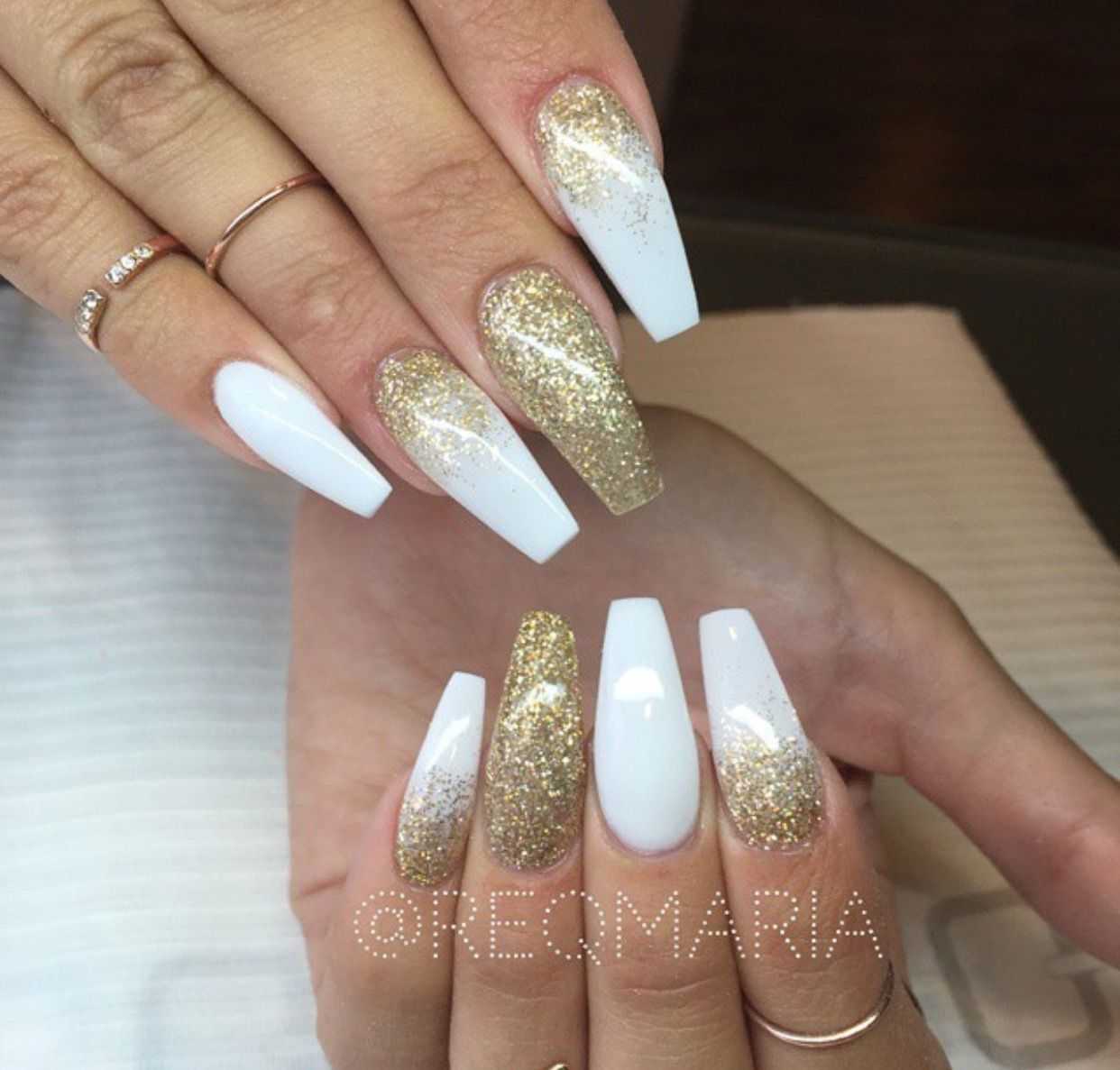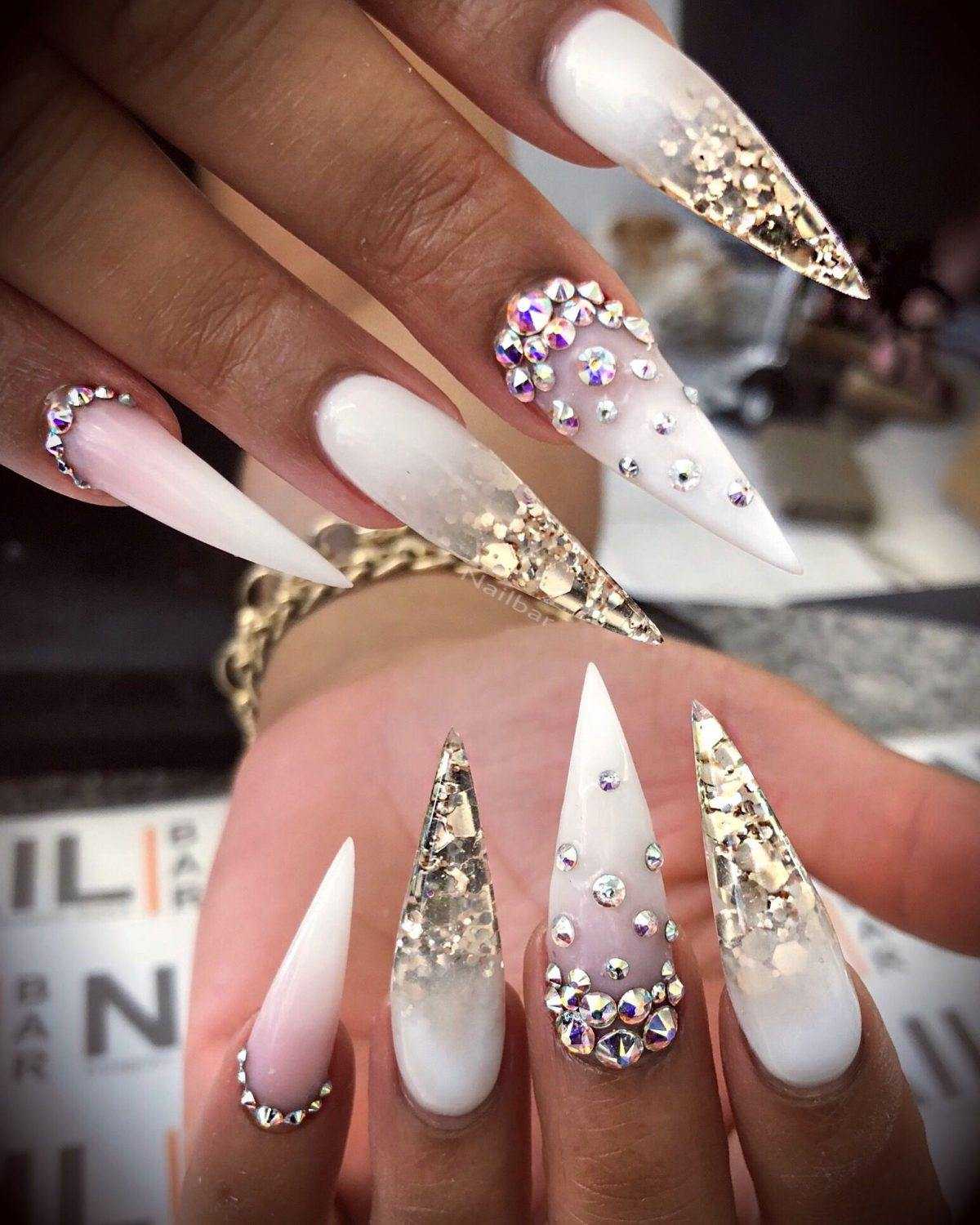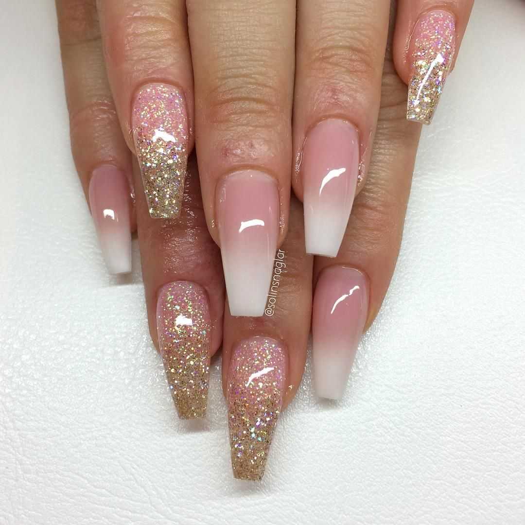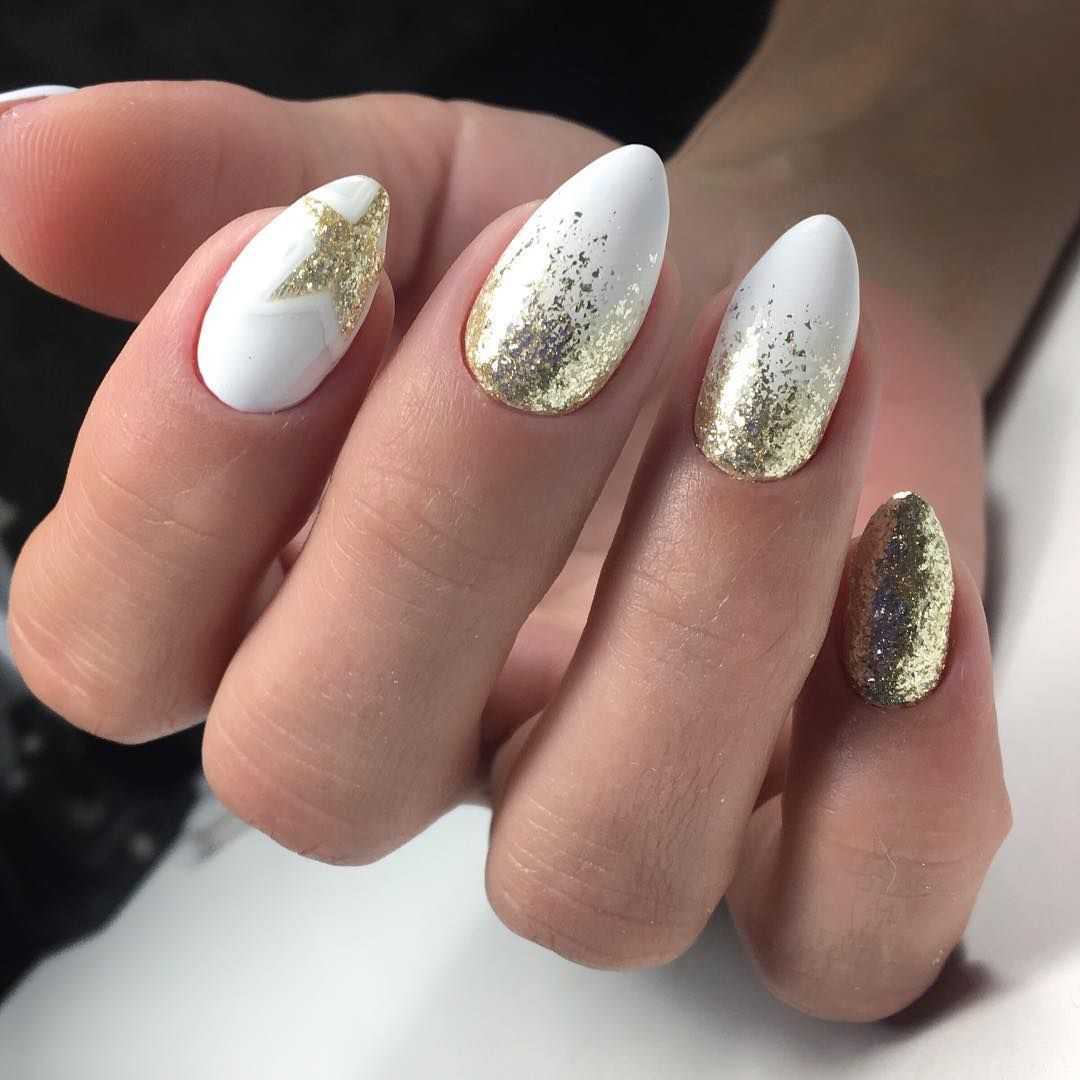 Этот популярный, стильный и красивый прием никогда не утратит своей популярности в сфере нейл-арт индустрии. Известные и модные тенденции делятся на два типа – эффект градиента белого цвета с плавным переходом в блестки, а также растягивание сверкающих блесток на ногтевой пластине, покрытой белым тоном. При этом в любом из вариантов можно использовать блестки разного цвета и формы. Омбре, выполненное при использовании блесток, очень хорошо сочетается с отдельными длинными и острыми ноготками, покрытыми полностью сверкающим декором.