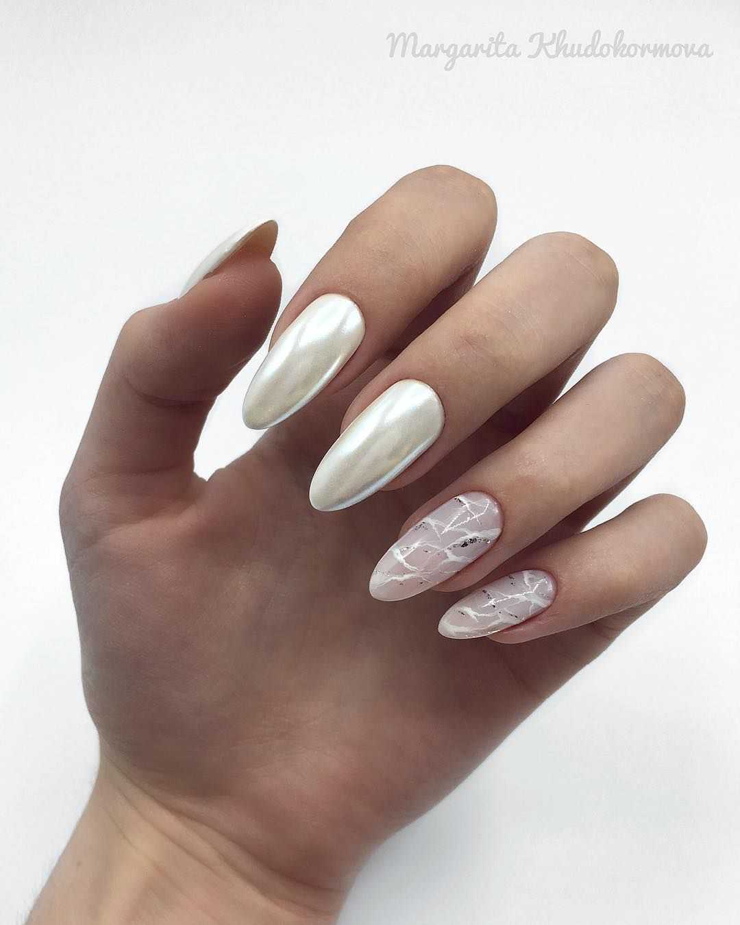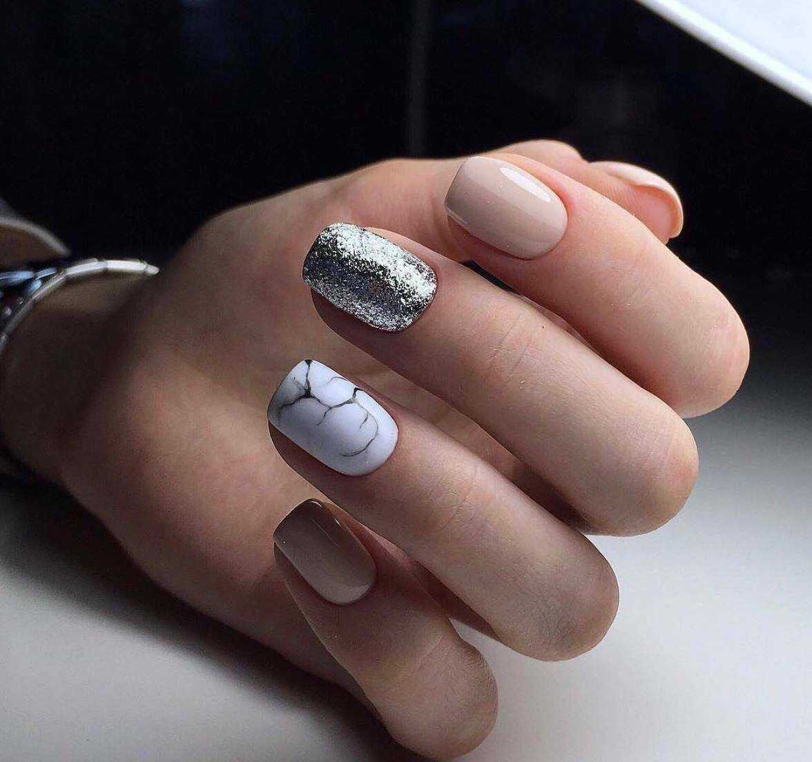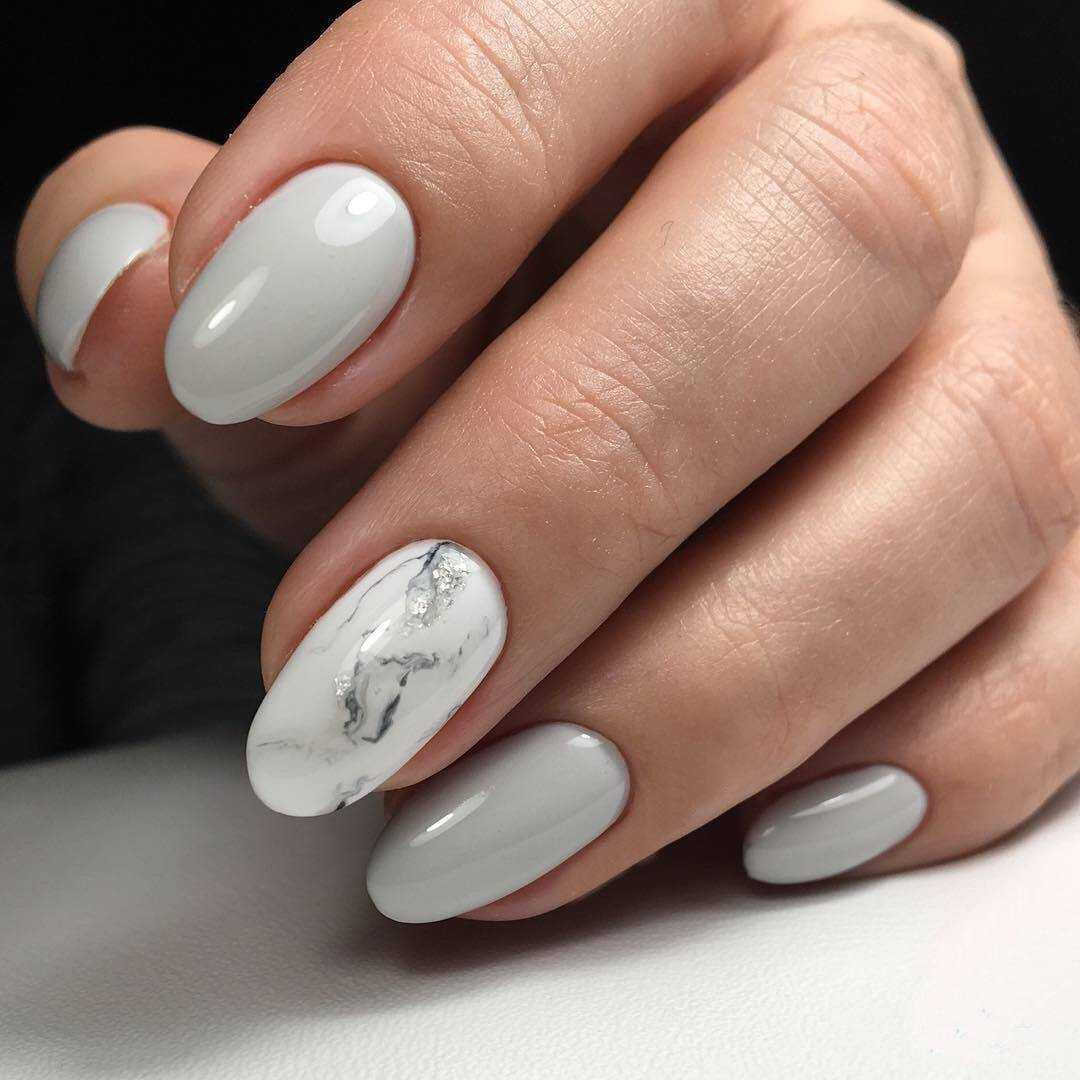 Актуальный и элементарный в исполнении мраморный маникюр позволит сочетать белый лак с серебряными блестками или с цветными акцентами – все зависит от вашего настроения и предназначения дизайна. Чтобы аккуратно воссоздать красивый мраморный эффект, модницы обычно используют тонкую кисть и немного художественного таланта. Еще одна хитрость – выполнение техники с помощью воды и мятого пакета.