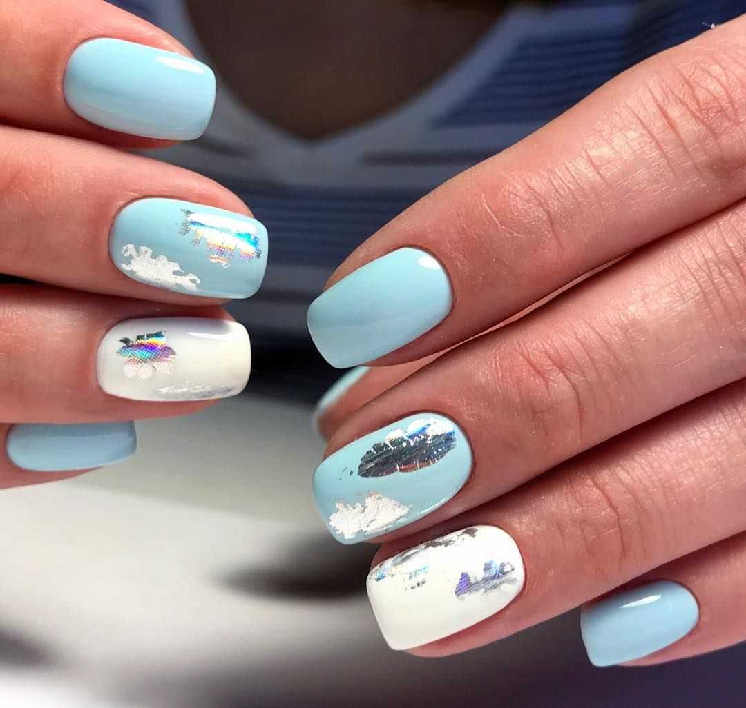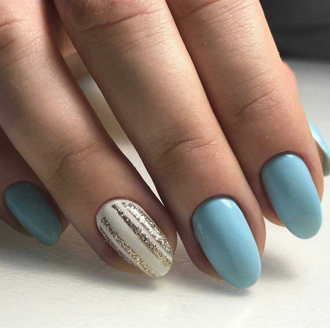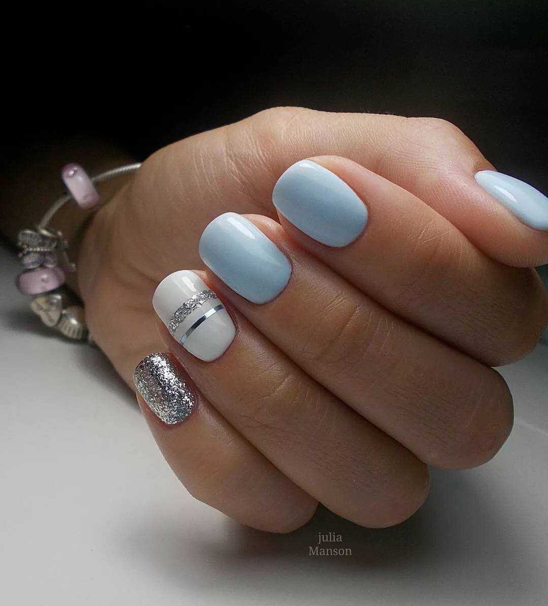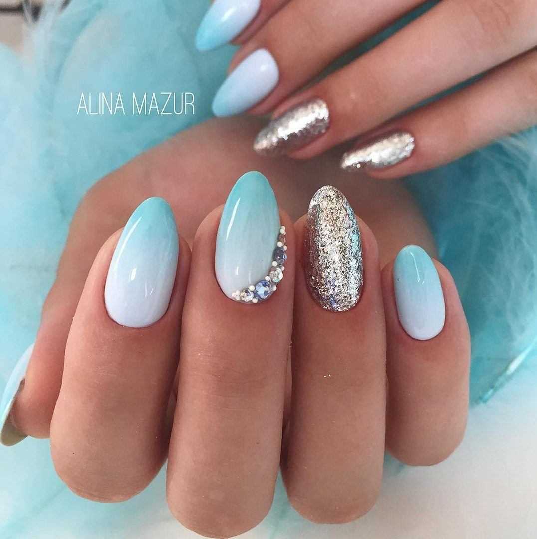 Еще один нежный и легкий оттенок для маникюра – это голубой. Дизайн в бело-голубых тонах навевает мысли о летнем отдыхе, вечерней прохладе и беззаботном отдыхе. Для дизайна ногтей помимо глиттера, можно использовать втирку или меланж.