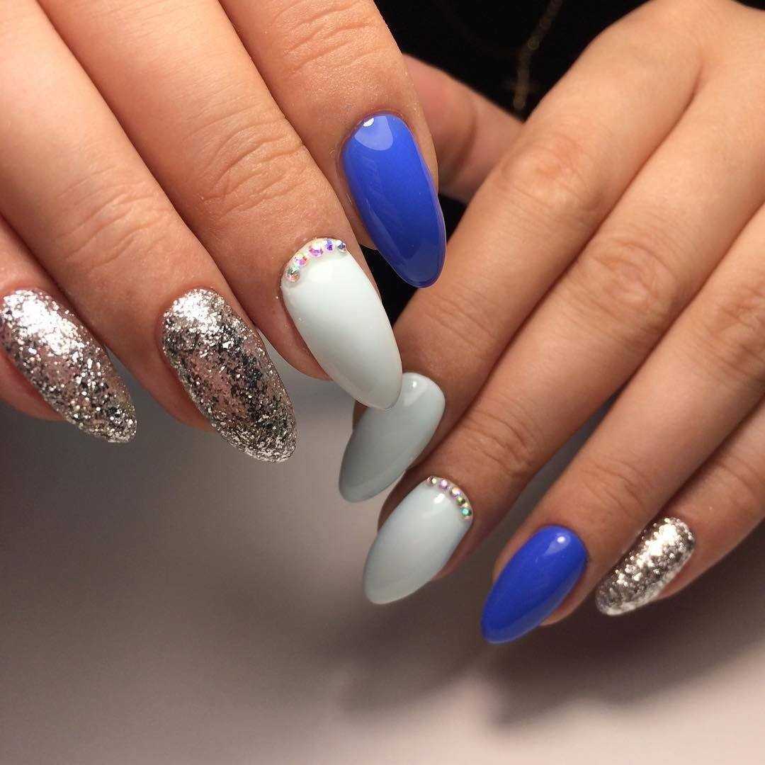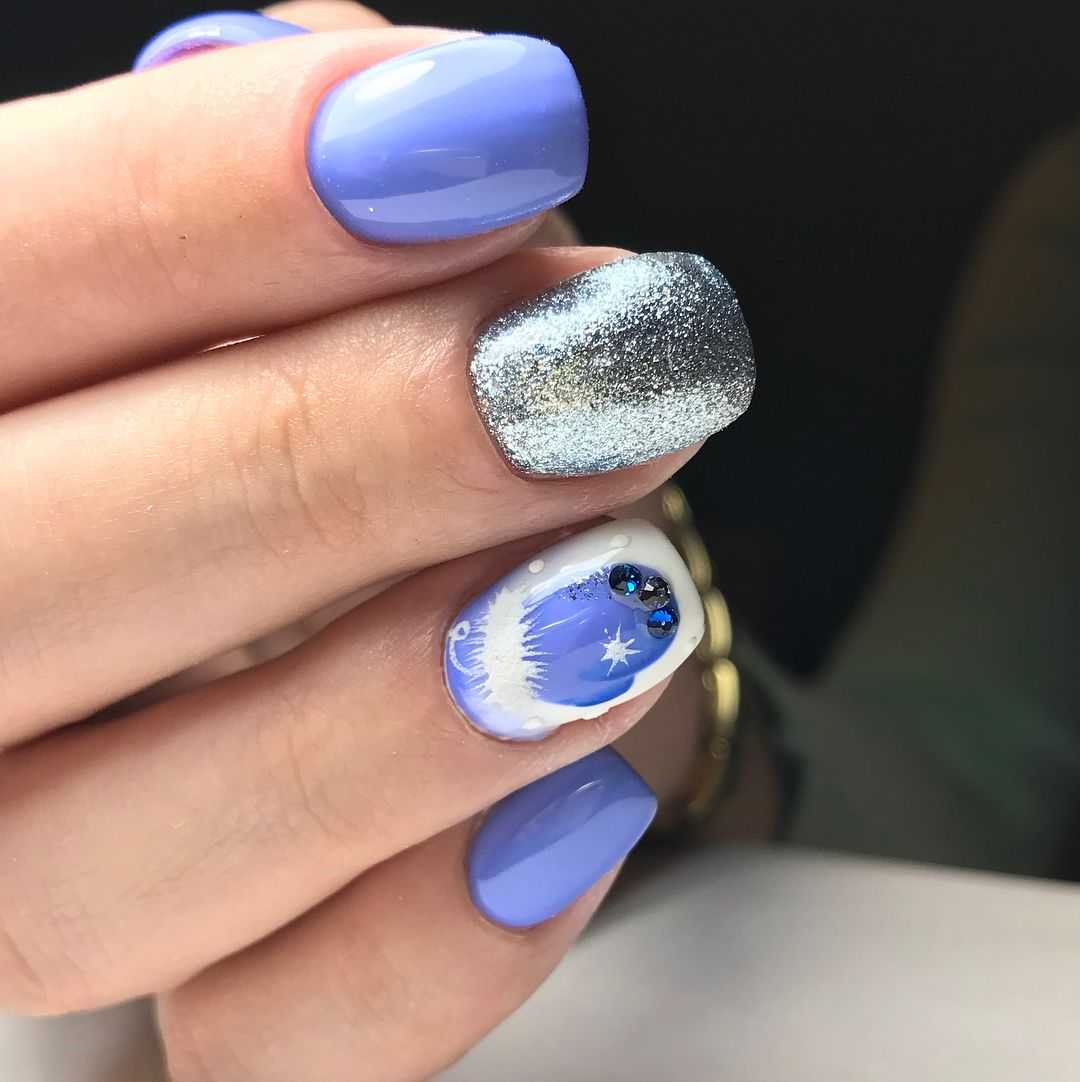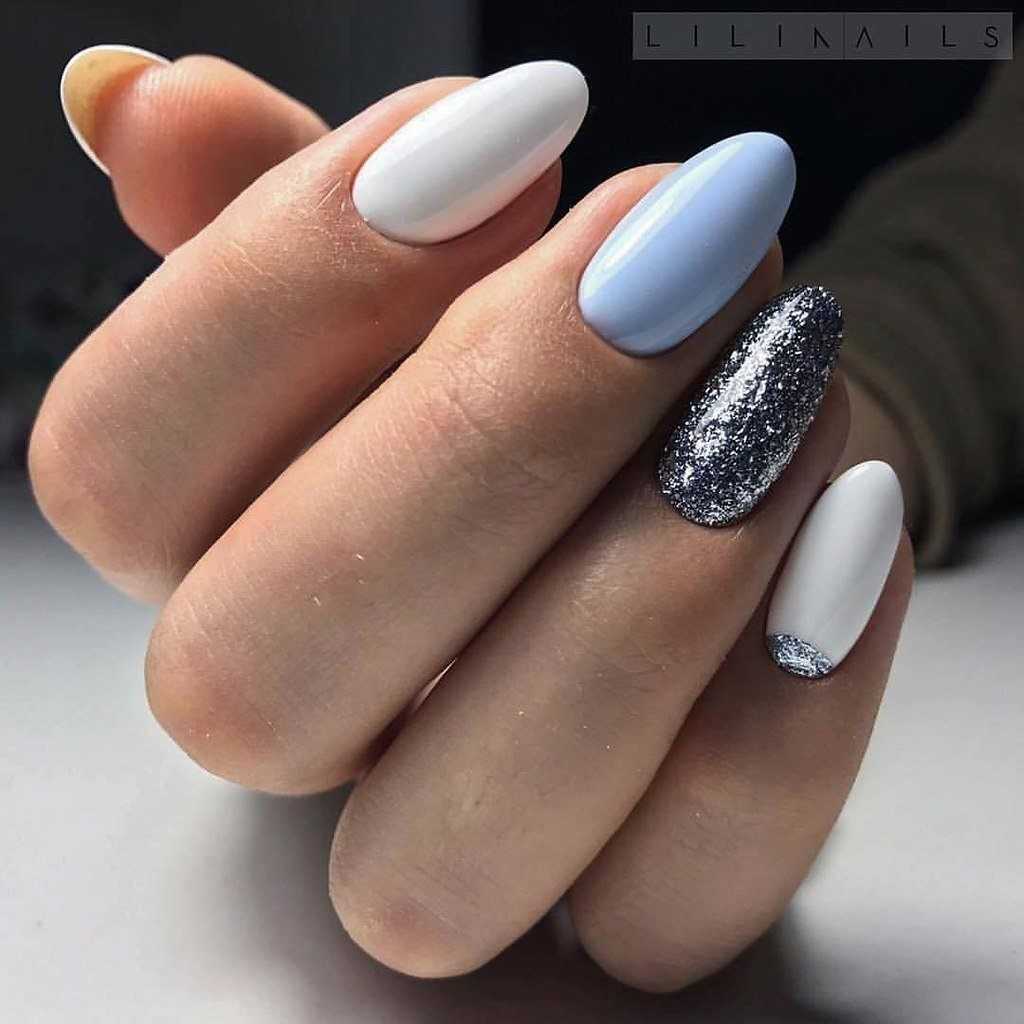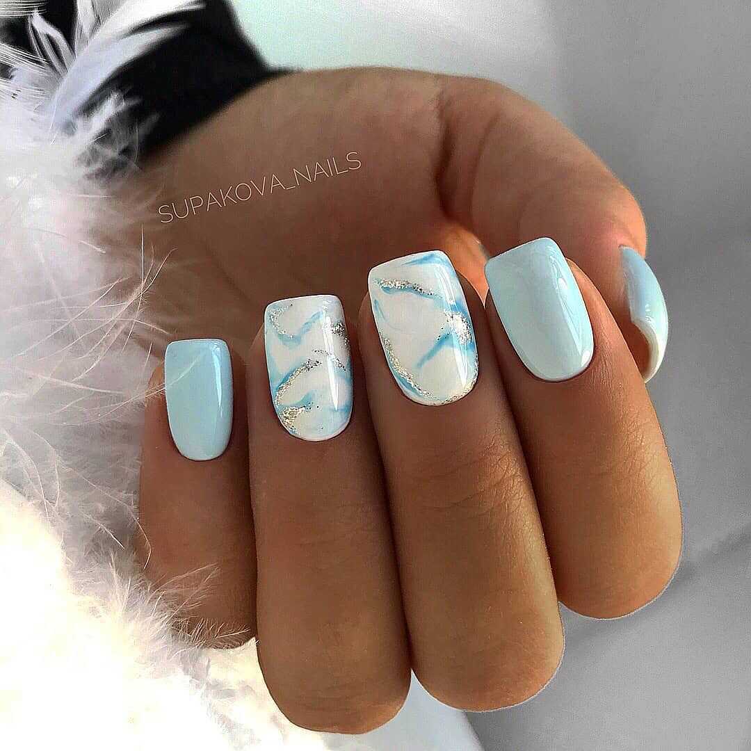 Еще один нежный и легкий оттенок для маникюра – это голубой. Дизайн в бело-голубых тонах навевает мысли о летнем отдыхе, вечерней прохладе и беззаботном отдыхе. Для дизайна ногтей помимо глиттера, можно использовать втирку или меланж.
