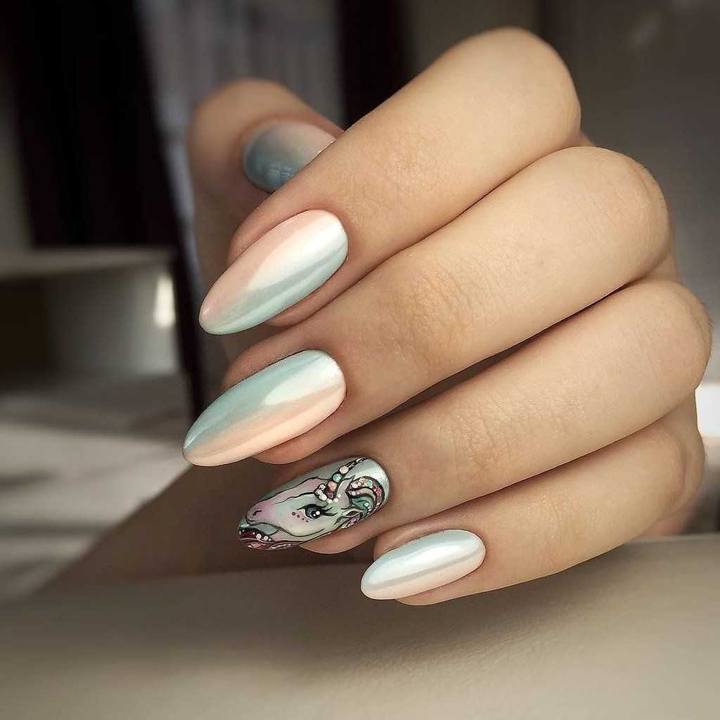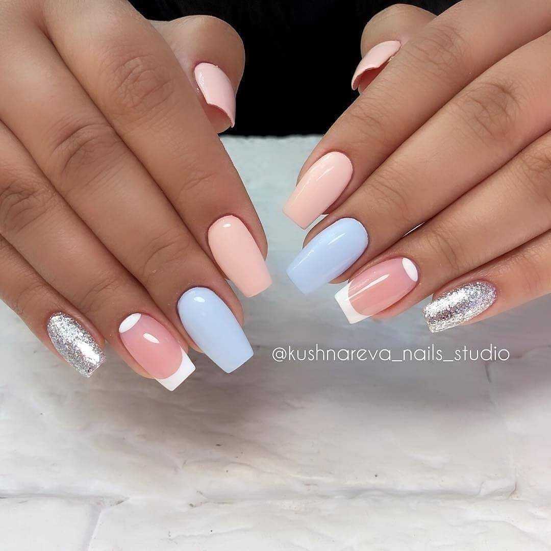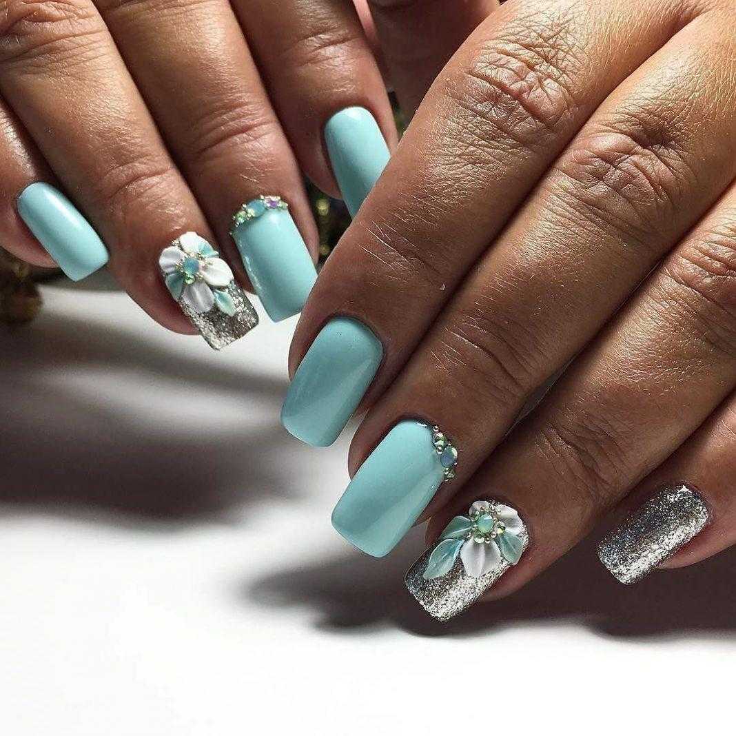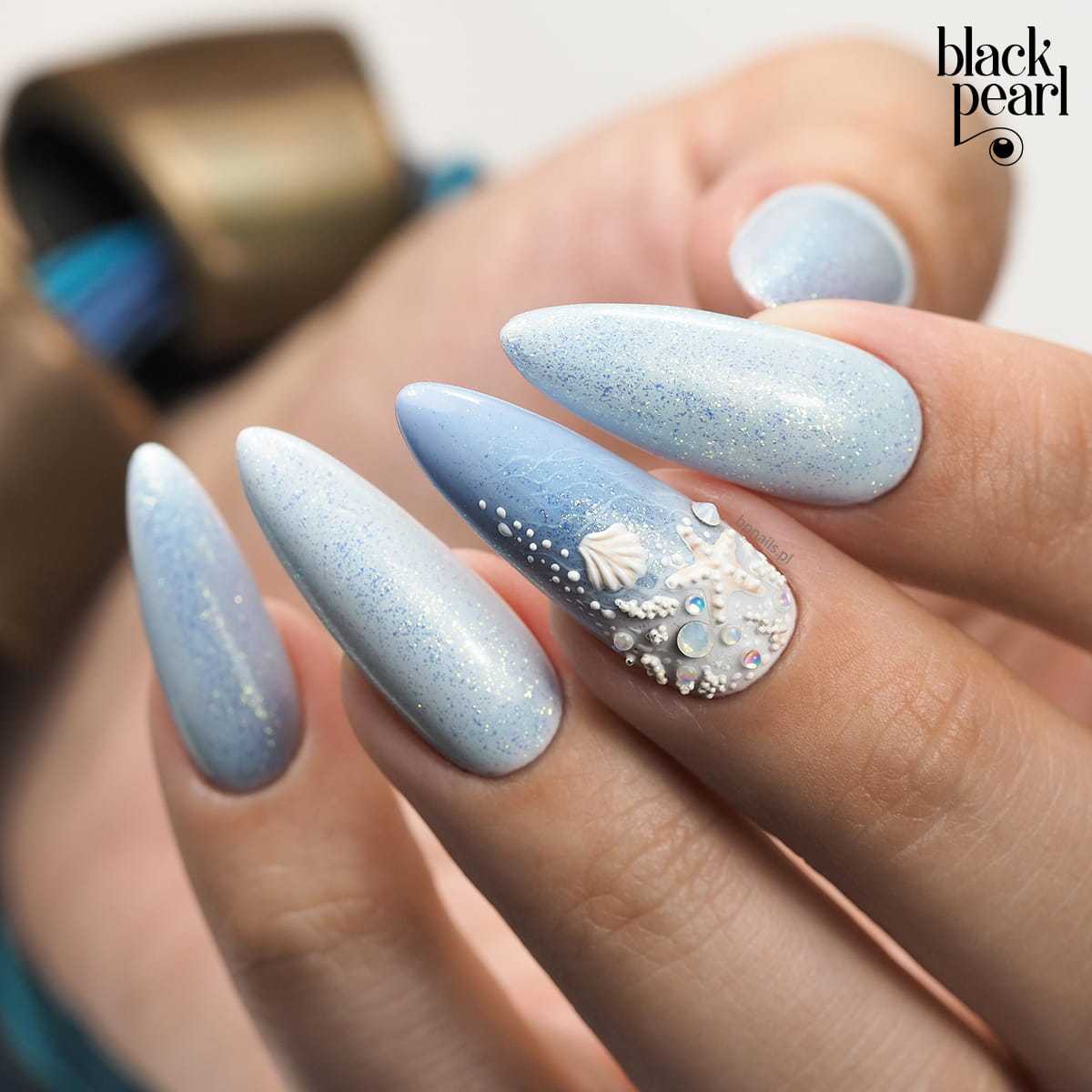 Еще один нежный и легкий оттенок для маникюра – это голубой. Дизайн в бело-голубых тонах навевает мысли о летнем отдыхе, вечерней прохладе и беззаботном отдыхе. Для дизайна ногтей помимо глиттера, можно использовать втирку или меланж.