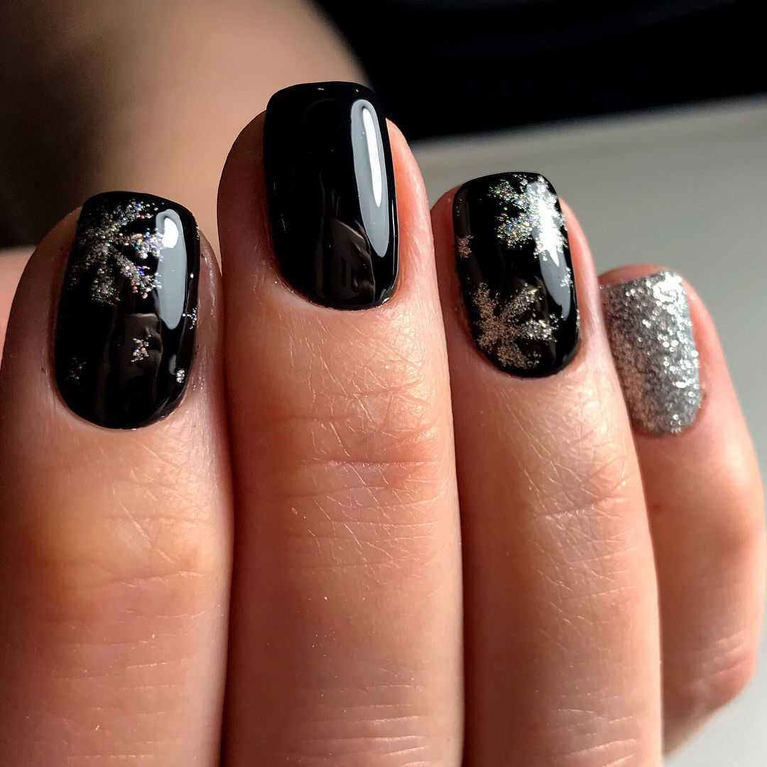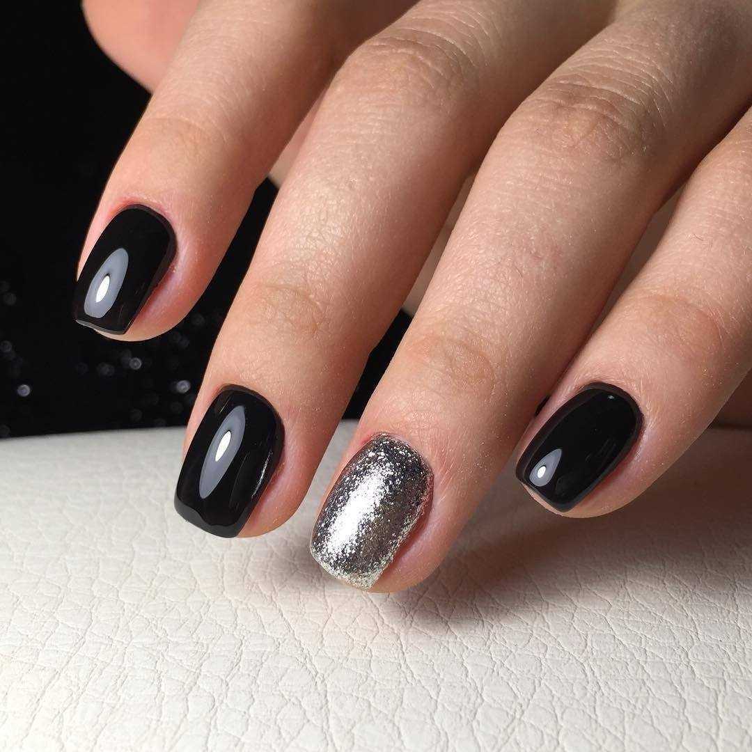 Однотонный черный маникюр без какого-либо декора, несомненно, будет выглядеть банально и пусто. Добавьте к черному цвету серебряные или золотые блестки и дизайн будет выглядеть гораздо эффектнее. Выбирайте для декора мелкий глиттер, втирку, меланж в черном цвете, “сахарок” и другие разновидности блестящего декора. Под дизайн отведите безымянный палец или мизинец. Так маникюр будет выглядеть сбалансировано и сдержанно.
