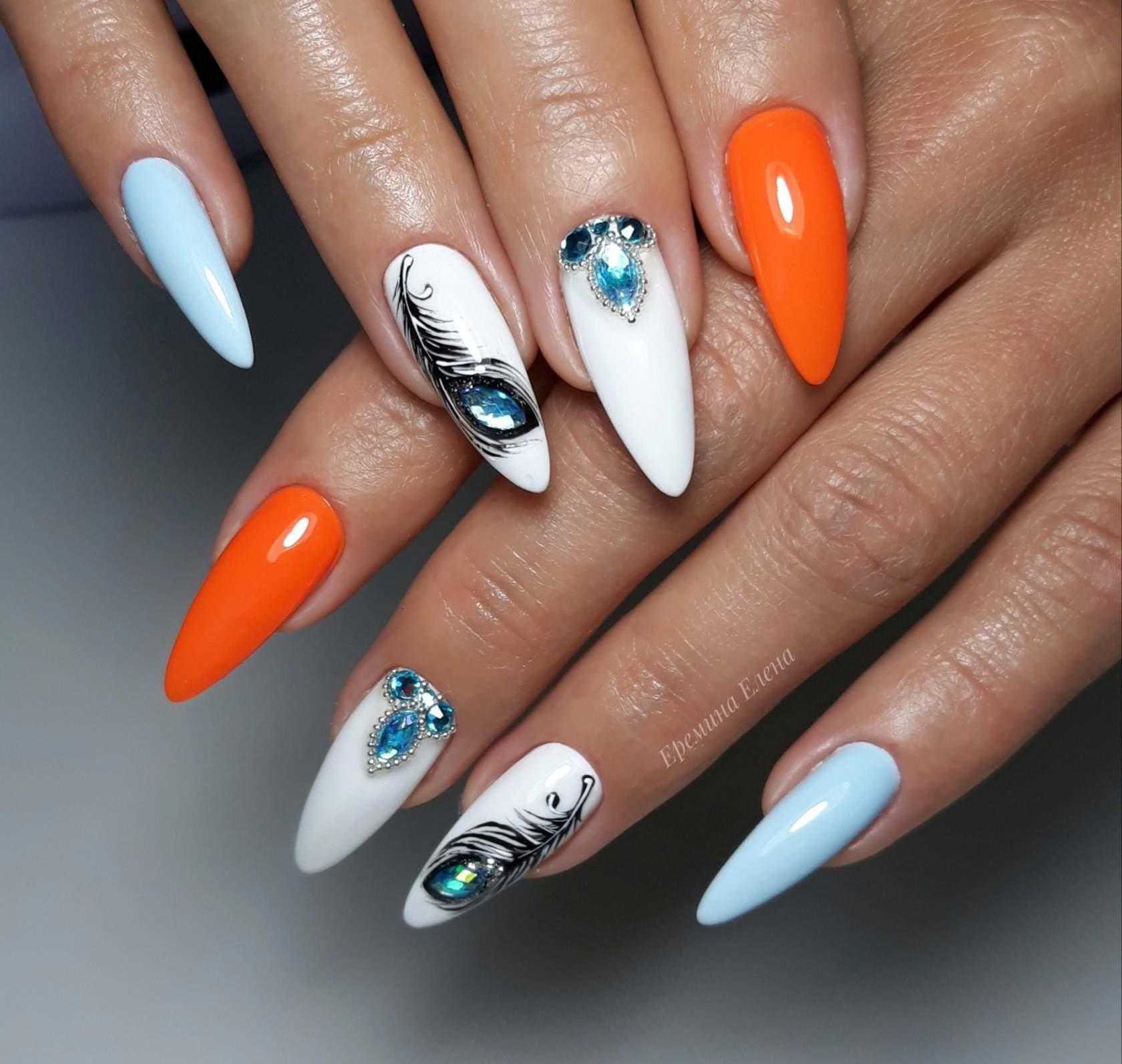 Эти цвета можно использовать в маникюре как в чистом виде, так и в комбинированном. Например, сочетать оранжевый с белым и с черным, синий с черным и с серебром, серый с серебром, белый с серым, оранжевый с золотистым и с черным, и так далее, на сколько хватит вашей фантазии.