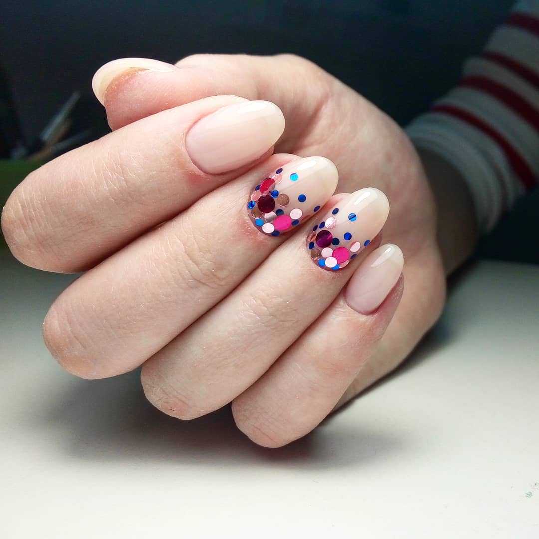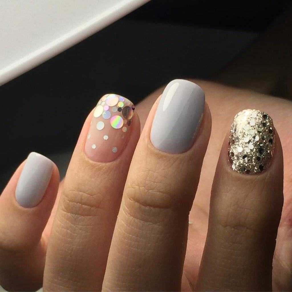 оригинальный мерцающий маникюр из блесток разного вида на коротких ногтях