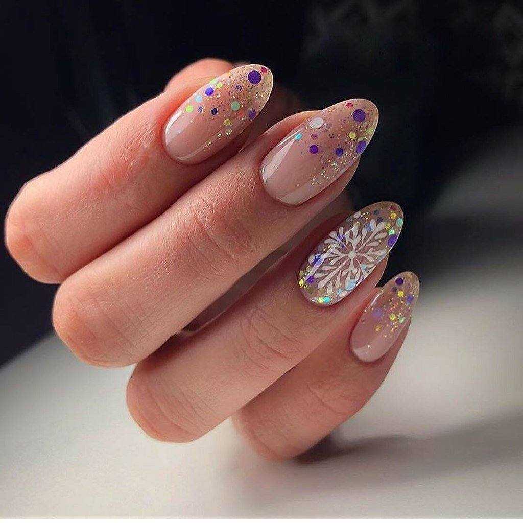 Крупные разноцветные блестки в сочетании с мелкими стразами станут дополнением новогоднего дизайна. С ними можно сочетать маникюр, выполненный с помощью любой техники: омбре, стемпинга, гелевой паутинки и других.
