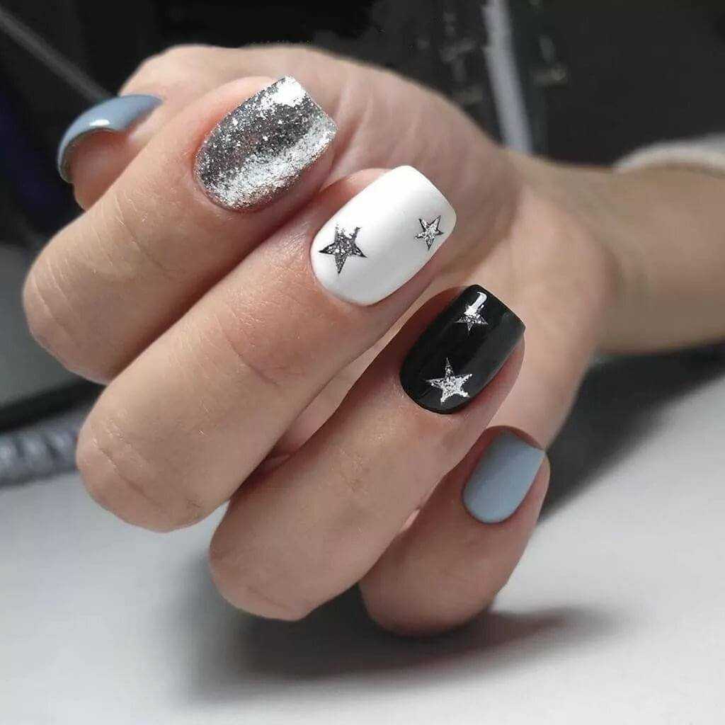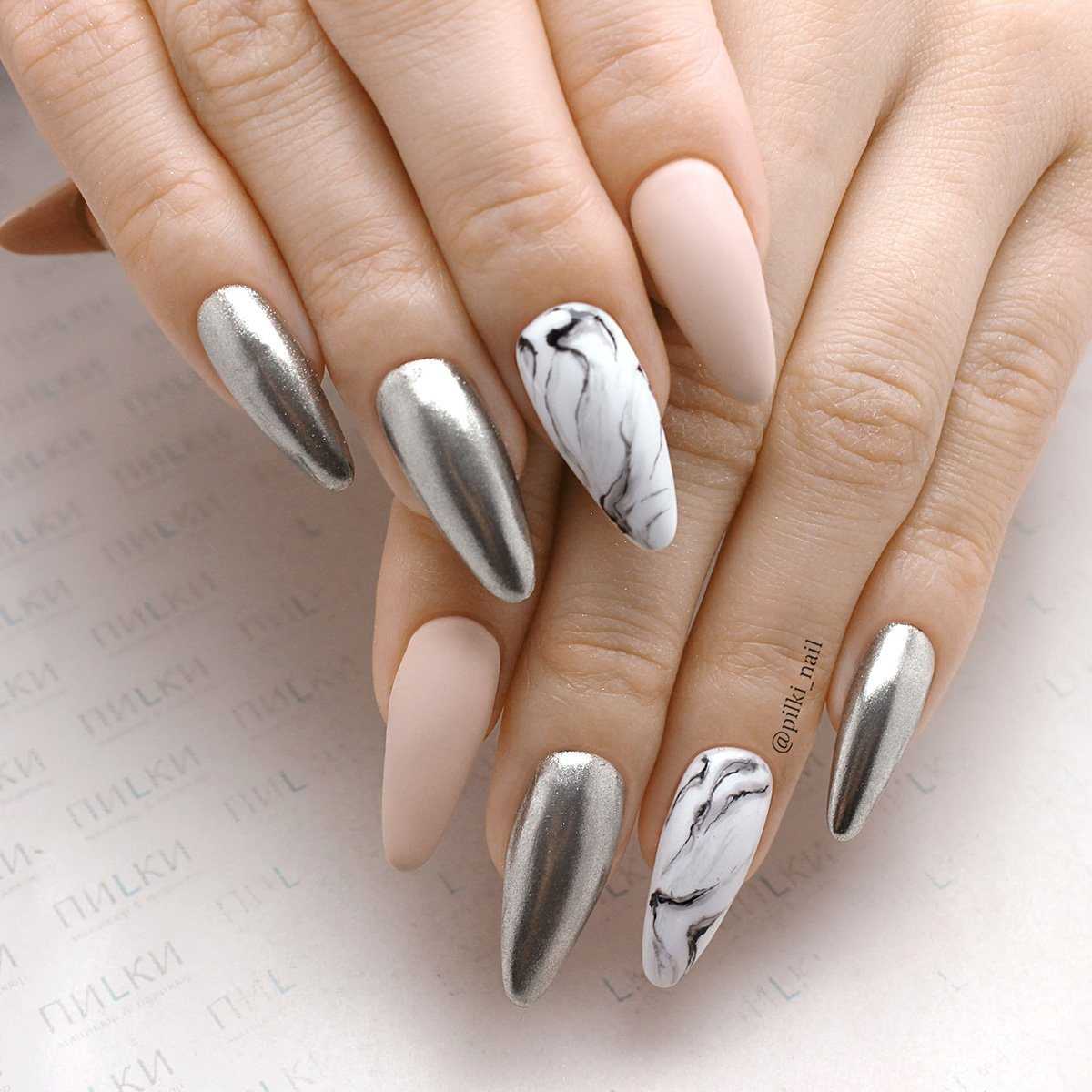Набирает популярность мраморный маникюр, подходящий к ногтям небольшой длины, а также футуристический ромбовидный дизайн с глянцевыми витражами и гелевыми пластинами. В качестве новой черно-белой дизайнерской идеи возможно применение гель-лака, а также всевозможным металлических пигментов, а также набирающие популярность вставки.
