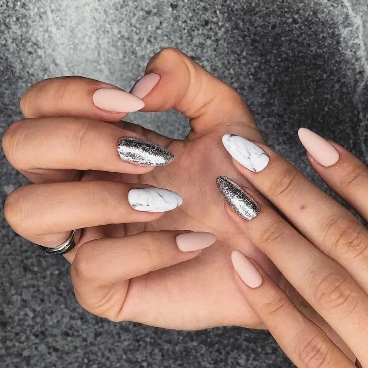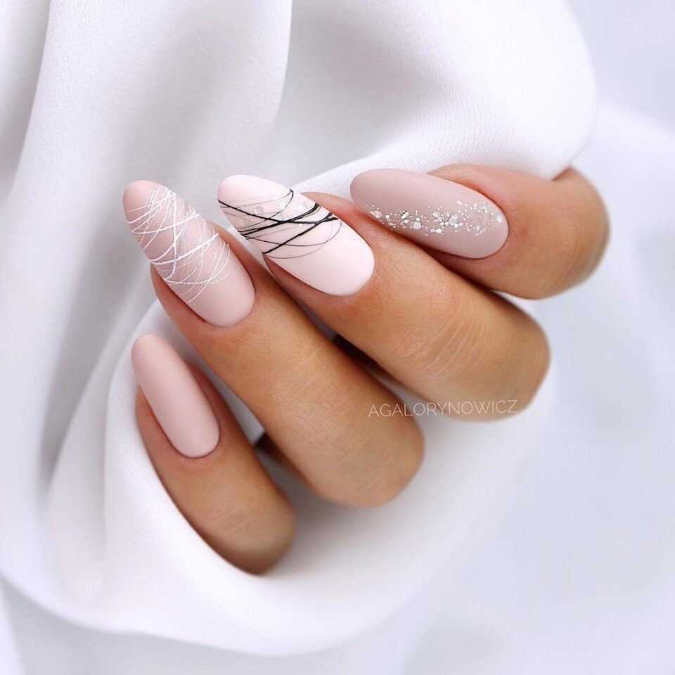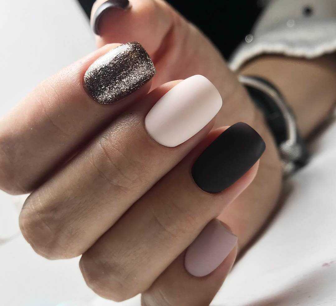 На пике популярности сегодня находится использование блесток с матовым лаком. Такой нэйл-арт будет выглядеть изысканно, строго и уместно, особенно если речь идет о светском приеме или кооперативе.