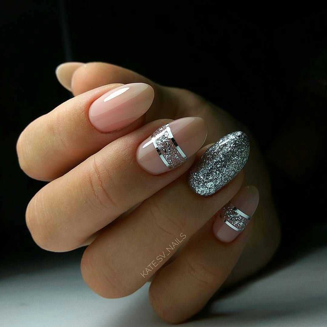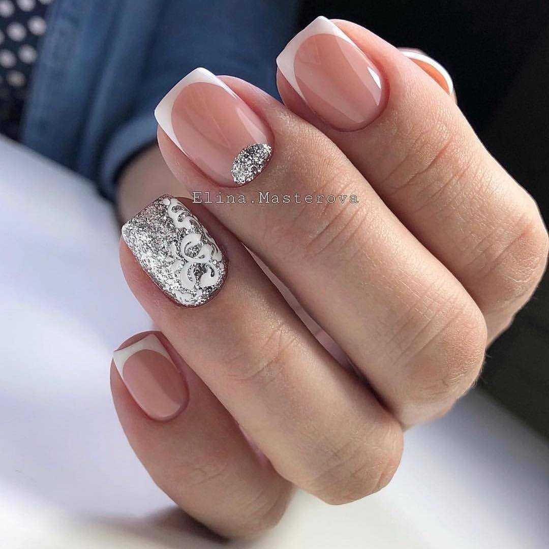 нежный маникюр на коротких ногтях, украшенный серебряными блестками