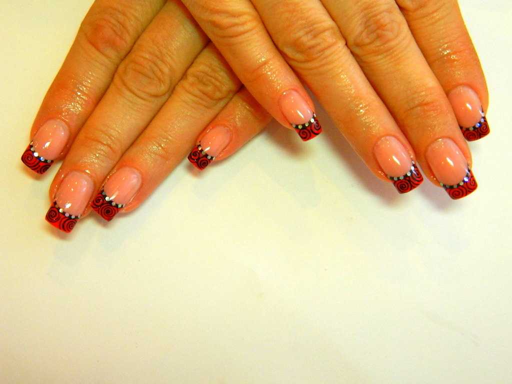 Стразы и камни, полюбившиеся многим модницам в одежде, обуви и аксессуарах, плотно заняли свое место и в ногтевом дизайне. Этот вид нейл-декора мастер может использовать, чтобы разнообразить и сделать более эффектным красный френч.