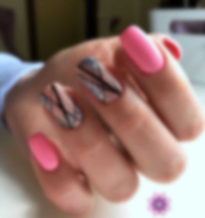 - Эффект разных текстур. Относительно новый тренд в дизайне маникюра. Его делают с использованием различных трафаретов. На розовом фоне создают черные наслоения.