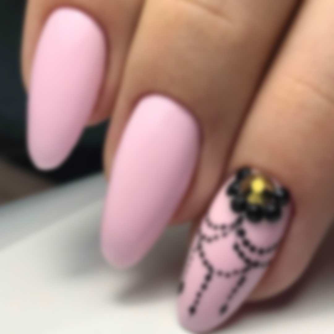 - Матовость. Все более популярным становится матовый маникюр. Чтобы не перегрузить образ эффектами, стилисты советуют делать маникюр матового типа без использования дополнительных элементов декора. Самой популярной формой ногтей для создания матового маникюра в черно-розовом цвете остаются острые ногти.