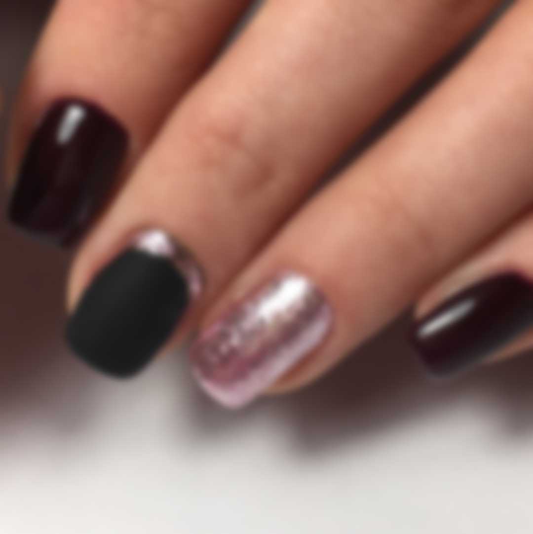 Матовый маникюр с черным и розовым оттенком смотрится бесподобно. Яркий цвет сделает дизайн нежным и романтичным, а темный бархат принесет в образ строгость. Это отличный вариант для прогулки или вечеринки. Каждая модница сможет показать свою индивидуальность.