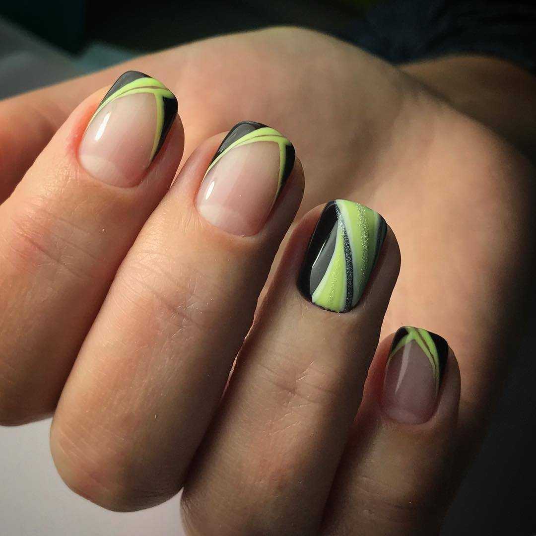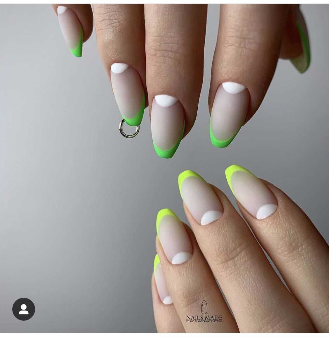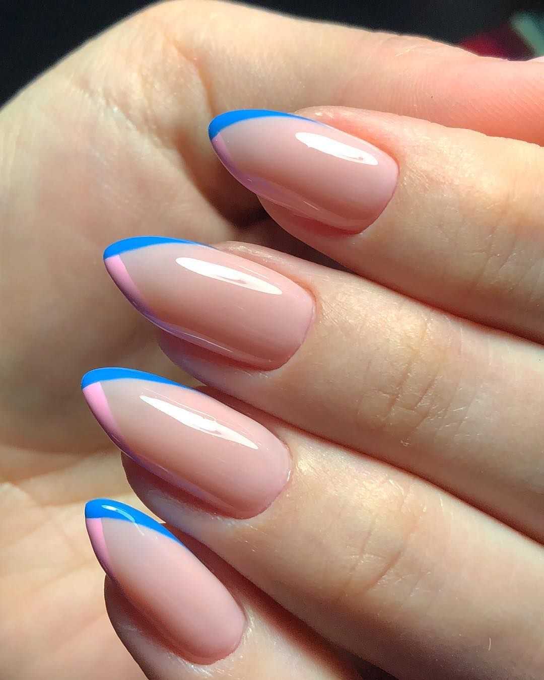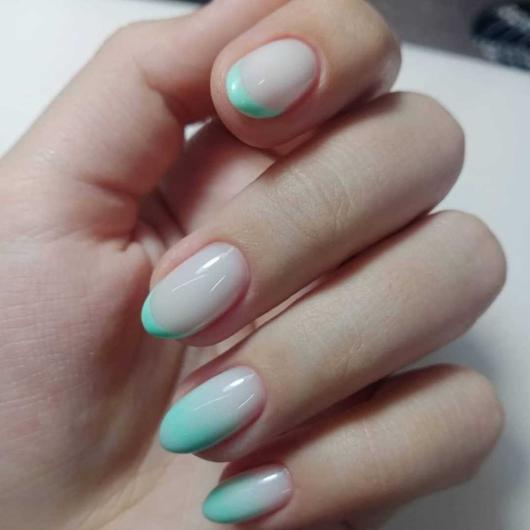 Тренд последних сезонов – цветной французский маникюр. Он великолепно выглядит на миндалевидных ногтях средней длины, придает естественный вид ноготкам с формой мягкий квадрат.