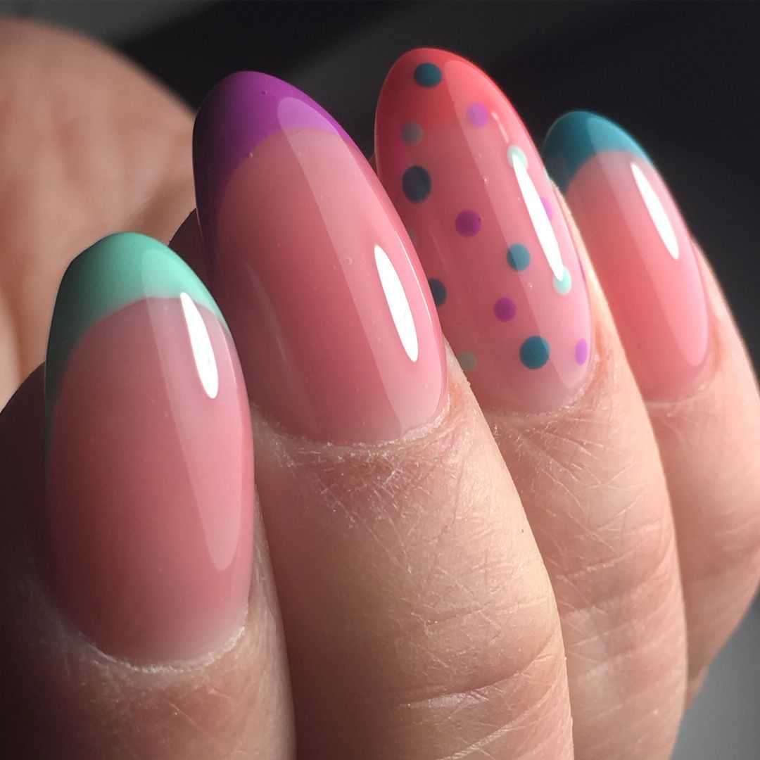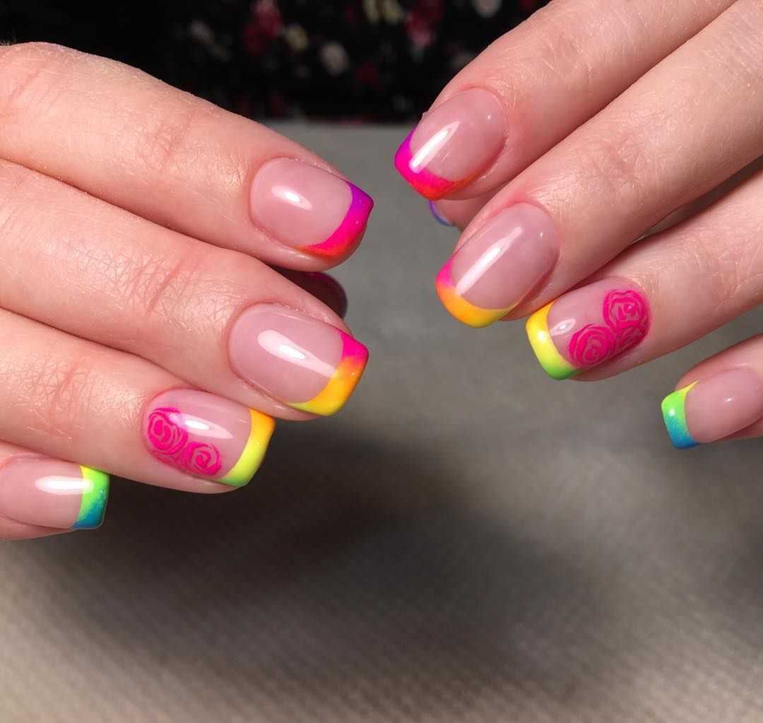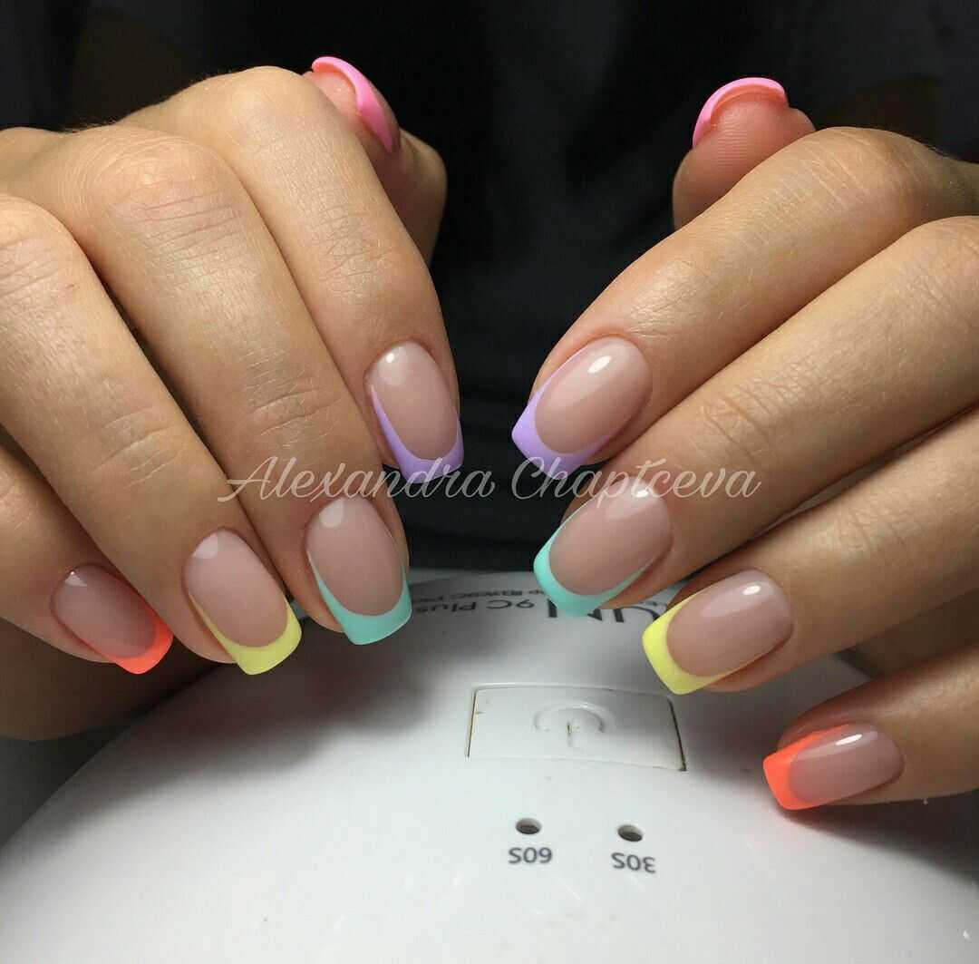 Цветной френч – отличное решение для летних нейл-артов. Дизайн содержит в себе сразу несколько оттенков, которые отлично вписываются в яркие образы.