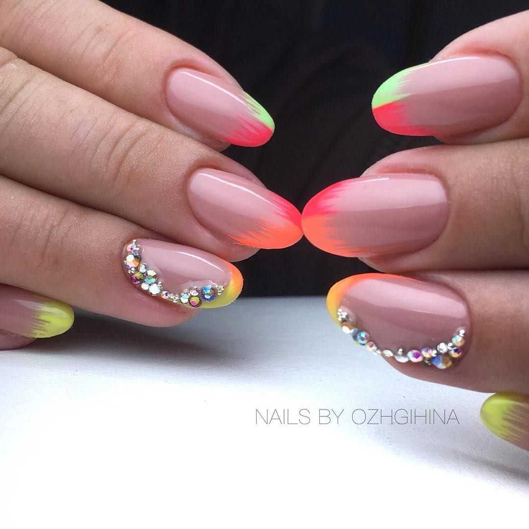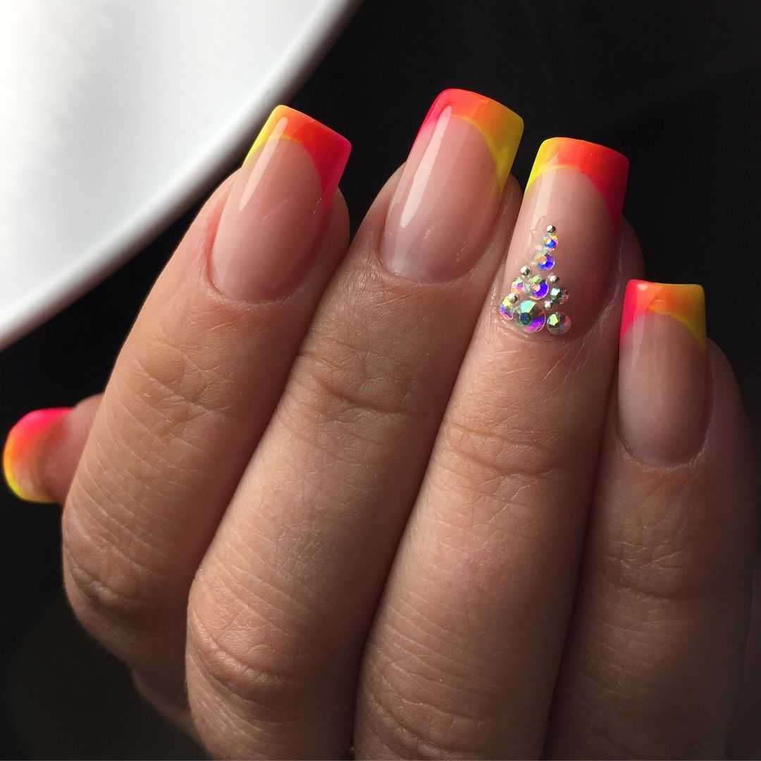 Для цветного френча используются яркие сочные оттенки. Это могут быть все 7 цветов радуги, которые распределяются сразу по всем ноготкам или несколько неоновых оттенков на каждом пальце. Остальная часть ногтевой пластины может быть покрыта прозрачным или белым лаком. Не стоит дополнять маникюр дополнительным декором, разноцветный край ногти и без него визуально выглядит тяжело. Единственным дополнением такого нейл-арта могут служить стразы в прикорневой зоне.