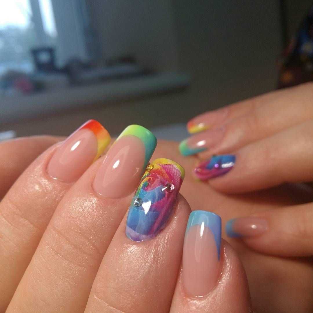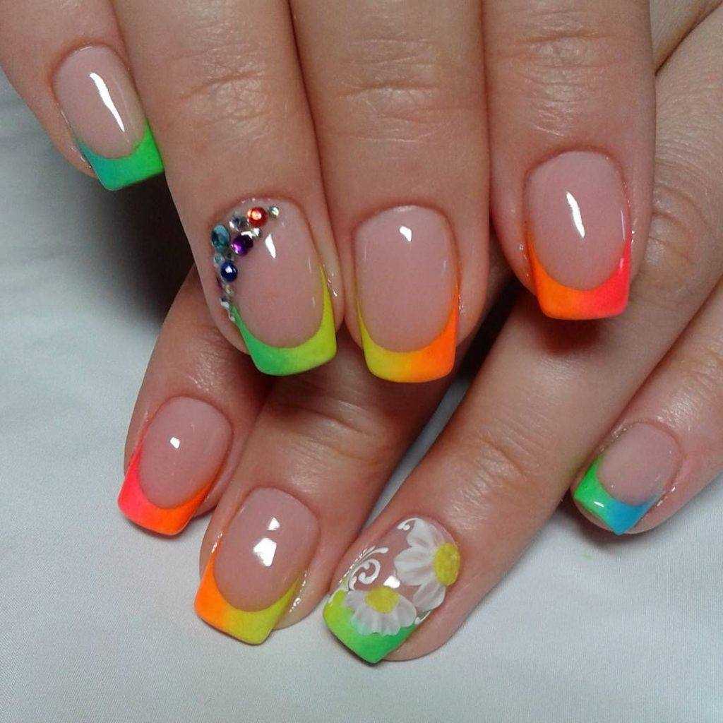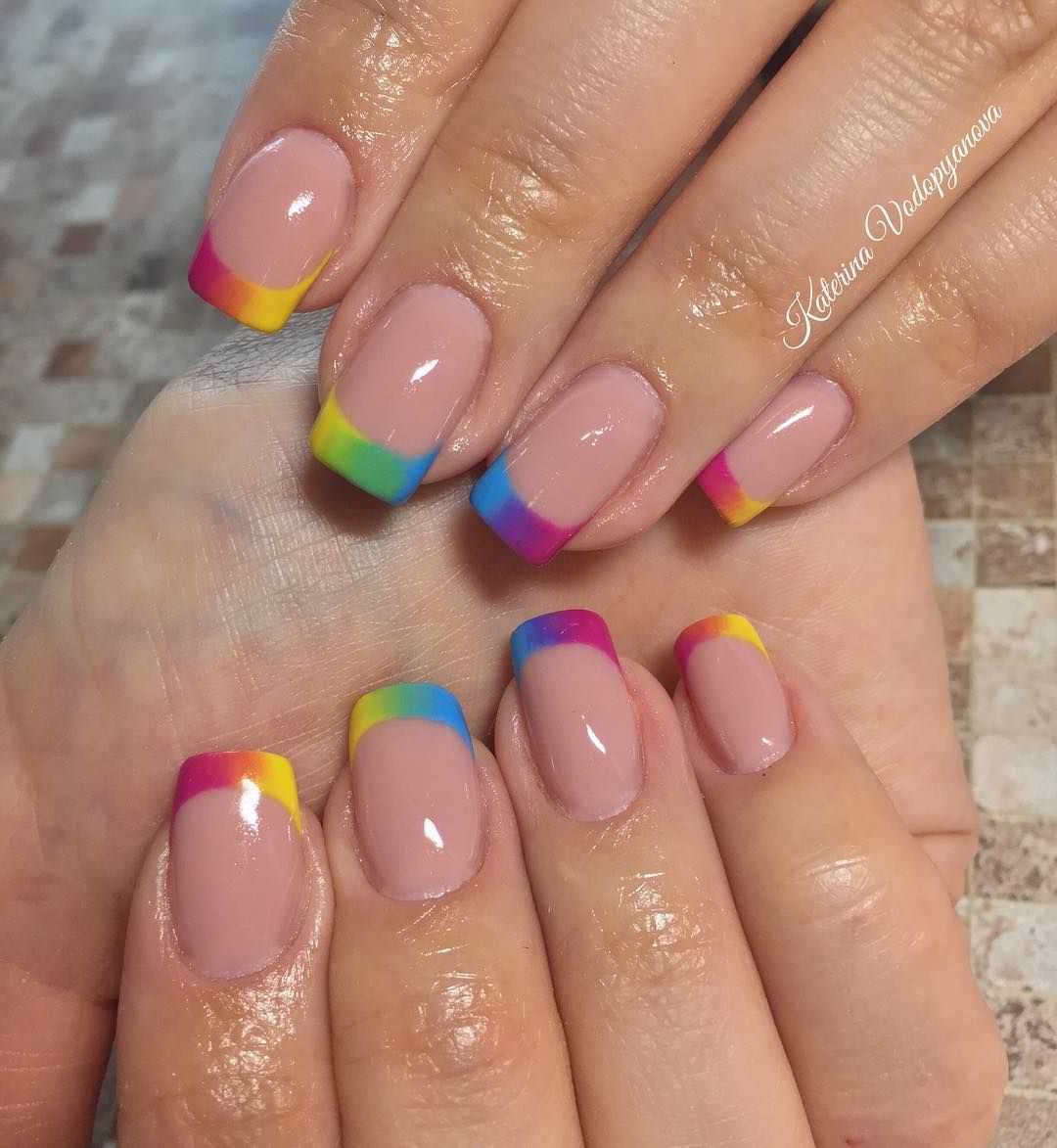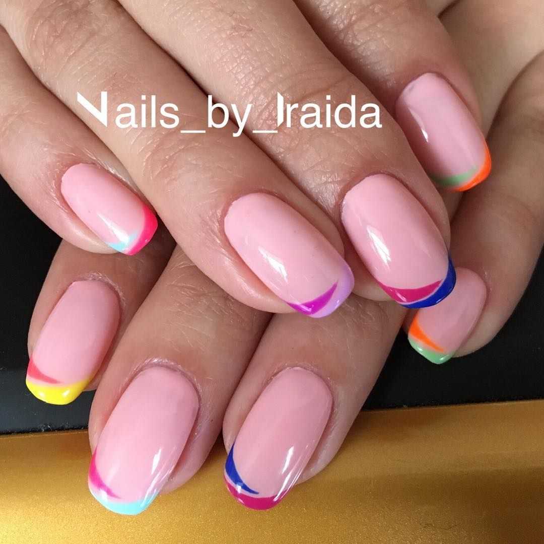 Вариант цветного френча, при котором каждый ноготь окрашивается в отдельный яркий цвет. Самый классный нейл-дизайн для лета уже оценили многие модницы в соц. сетях, так как он отлично сочетается с яркими летними коктейлями, купальниками и общей атмосферой релакса.