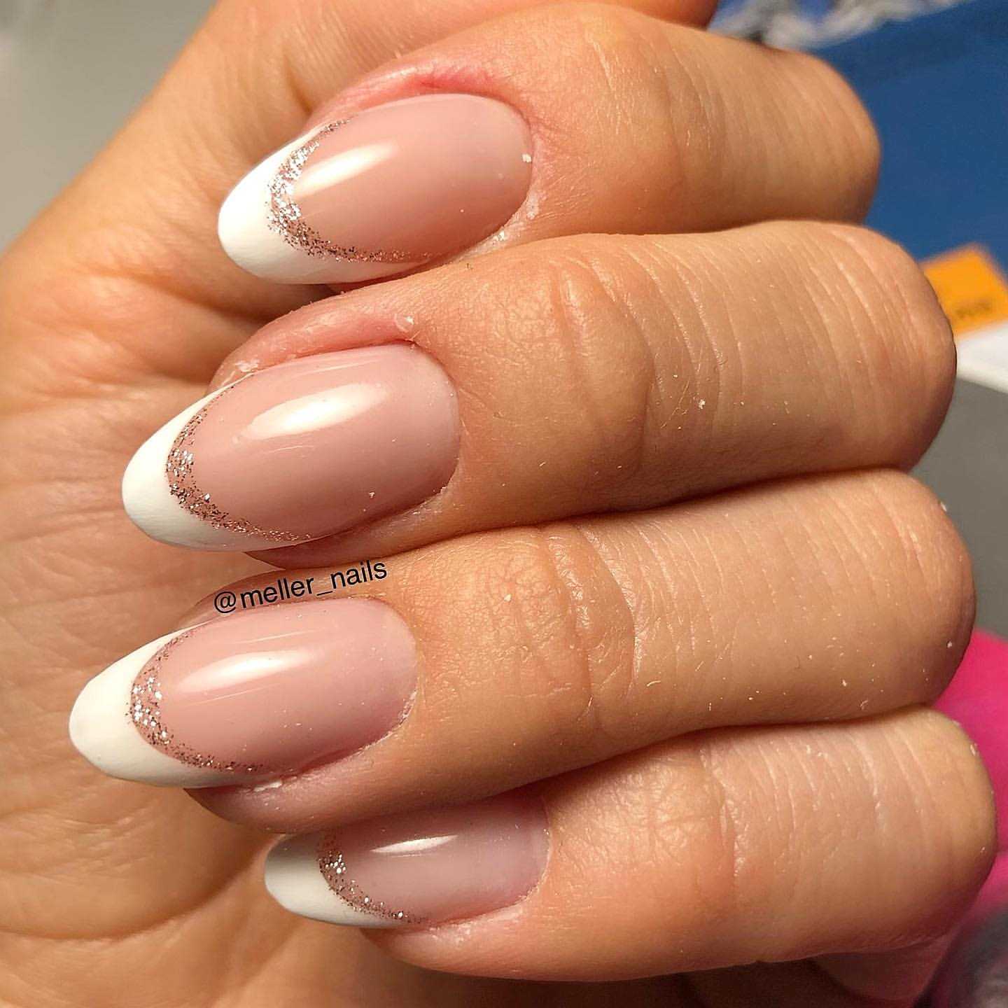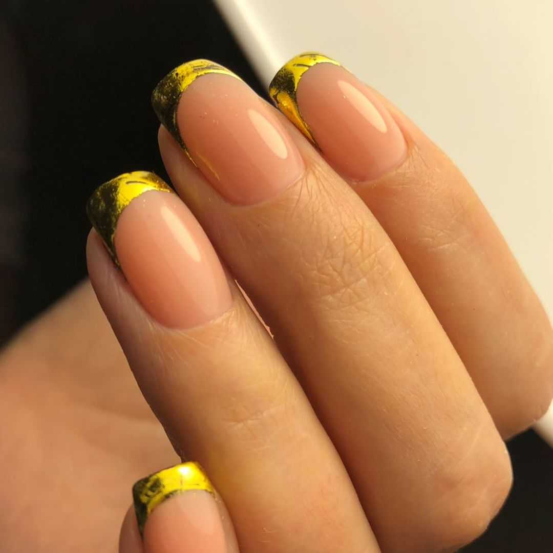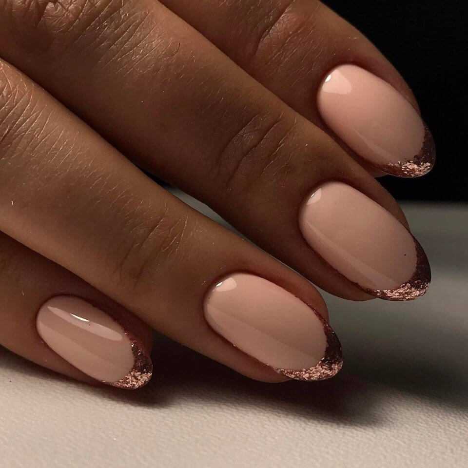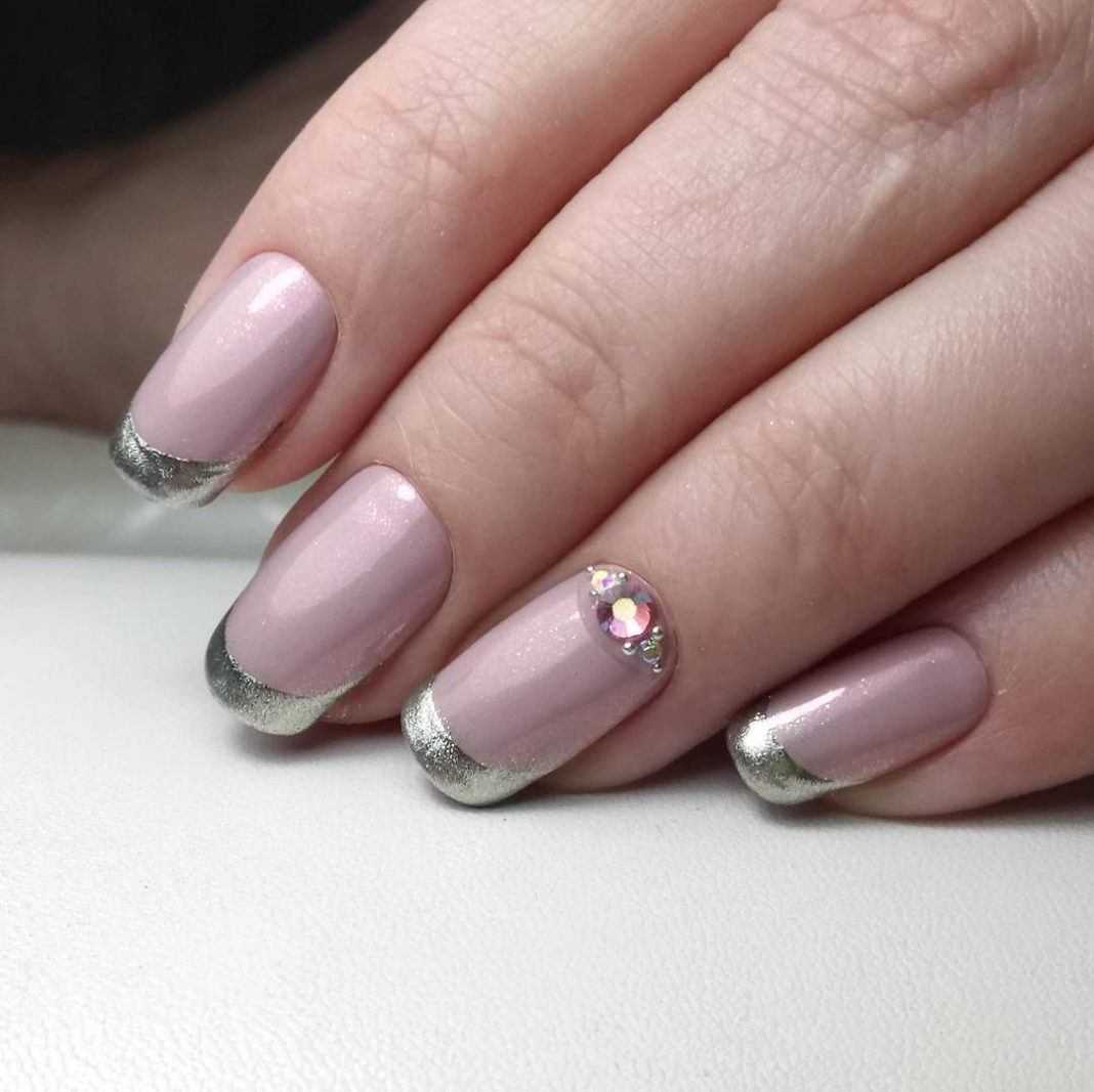 Разнообразить френч на короткие ногти 2023 можно, добавив блестки, пайетки, металлизированные элементы. В особой технике создается выкладной овальный френч. Гель заменяет краску на кончиках на переходы текстур с использованием современных техник нейл арта. Оттенок блесток или страз тоже подбирается индивидуально, сейчас их огромное количество. Одинаково хорошо будет смотреться серебристый или золотистый гель.