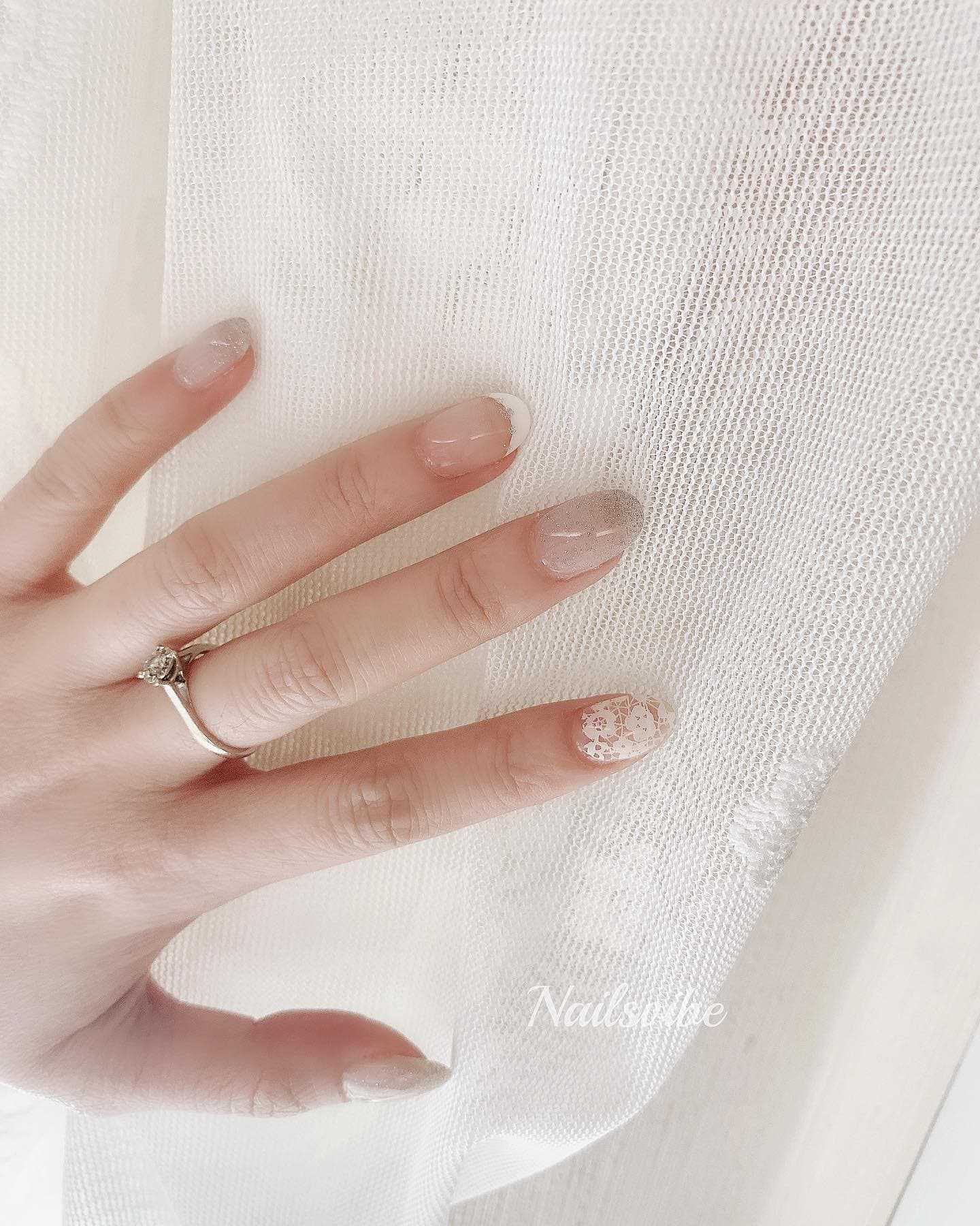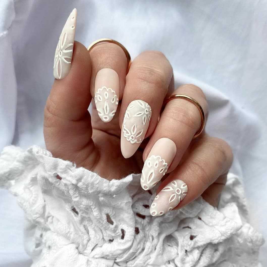 Нежный френч – лучший выбор для свадебного маникюра. Современный ажурный френч на ногтях выглядит сдержанно и скромно, без россыпи стразов и многоярусной лепки. Изысканные узоры белым лаком на бежевом или розовом фоне подчеркнут нежность и красоту невесты.