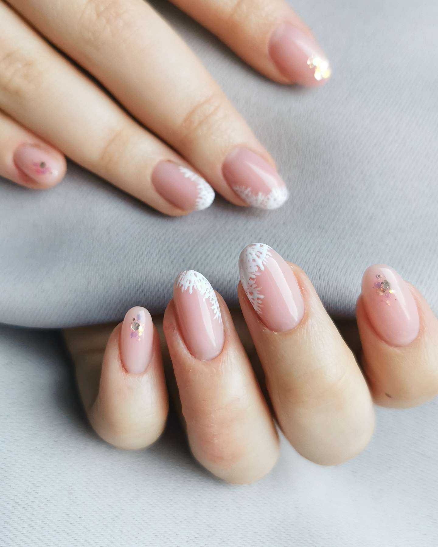 - декорированный. К белому френчу отлично подойдут не стразины и бусины, а пудровое покрытие, или мелкие блёстки;