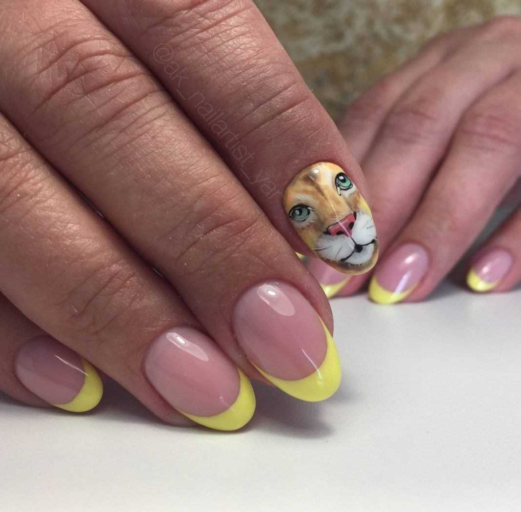 Супергорячий тренд – френч с рисунком, имитирующим животный принт. Зебра, жираф, леопард – выбирайте самостоятельно. Все эти виды френча на ногтях смотрятся сногсшибательно!