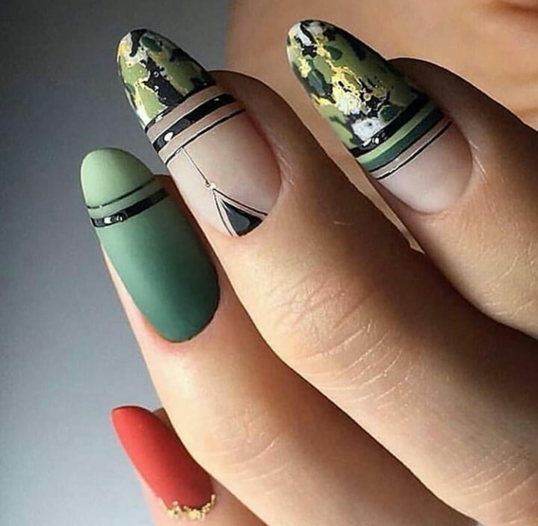 Приглушенные зеленые, черные и серые тона повторяют рисунок «зимнего» камуфляжа. Такие ногти будут смотреться очень стильно, но при этом не вызывающе.