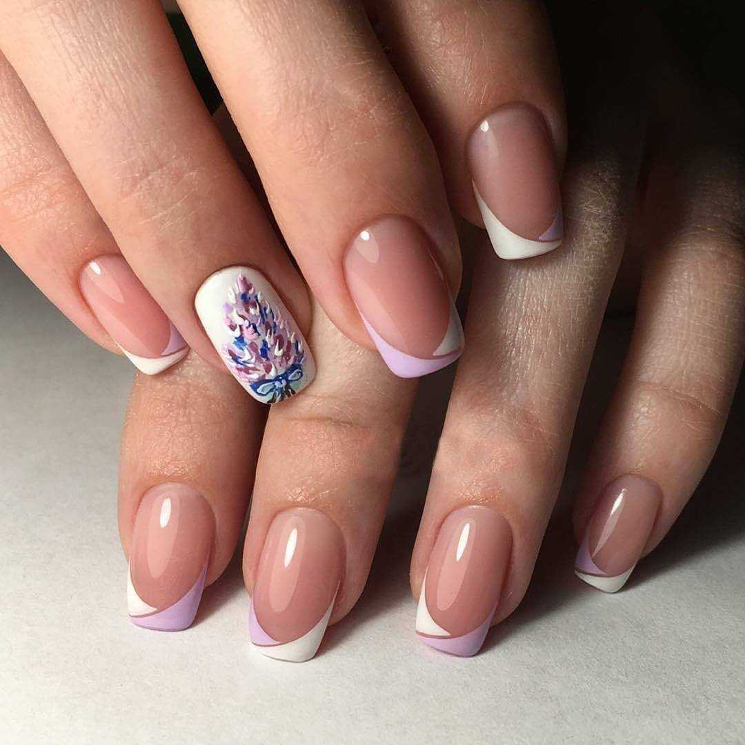 В топе модных тенденций французский маникюр с рисунком. Здесь несколько ногтей дополнительно украшаются рисунком. Выбор принта зависит от вашей фантазии, но все еще популярны растительные, абстрактные и цветочные мотивы.