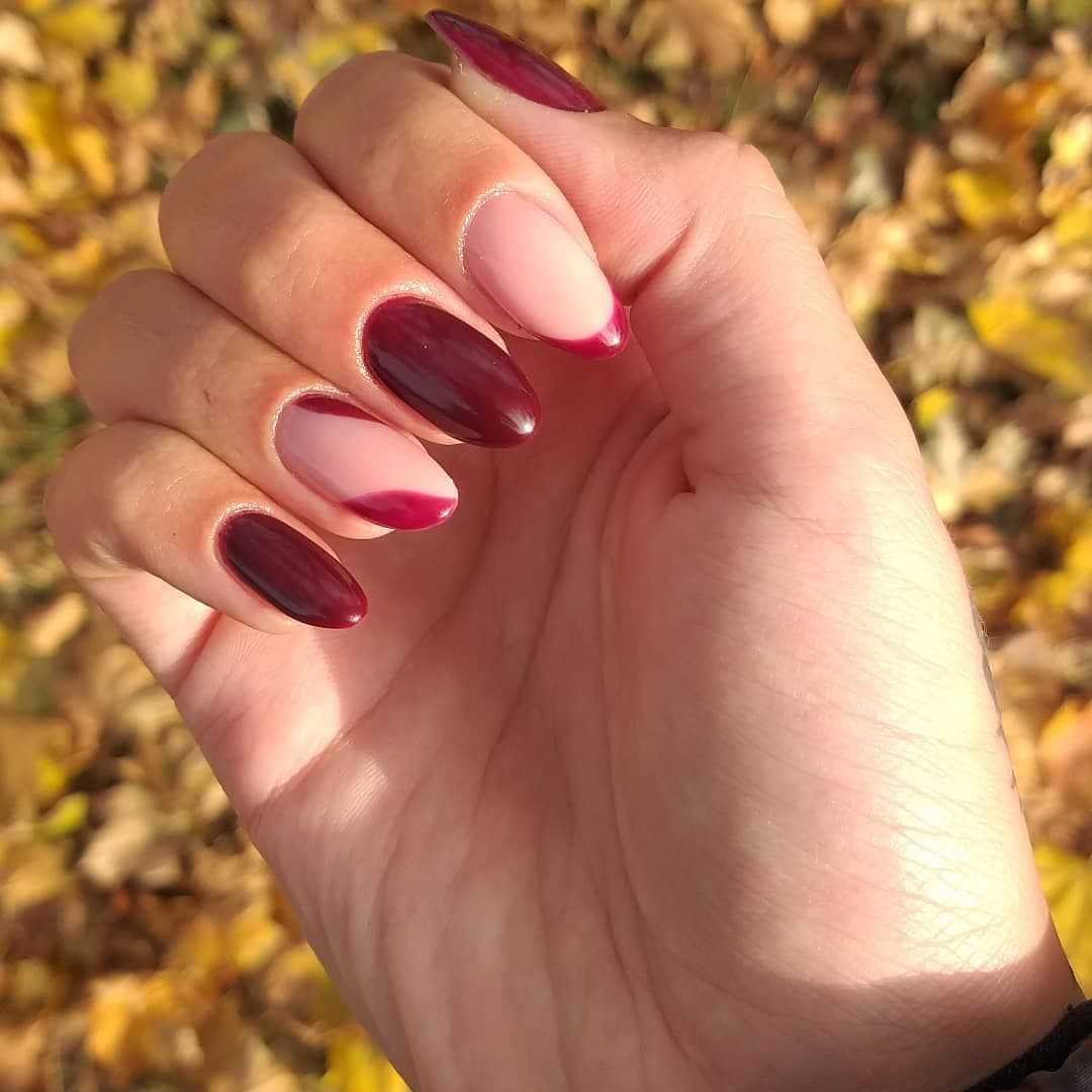 Французский маникюр омбре предполагает градиентное окрашивание одним или несколькими оттенками лака. Такой принт выглядит слегка размытым, его лучше всего сочетать с наращиванием ногтей. Если интересует стильный френч на острые ногти 2023, то омбре в модном оттенке точно подойдет.