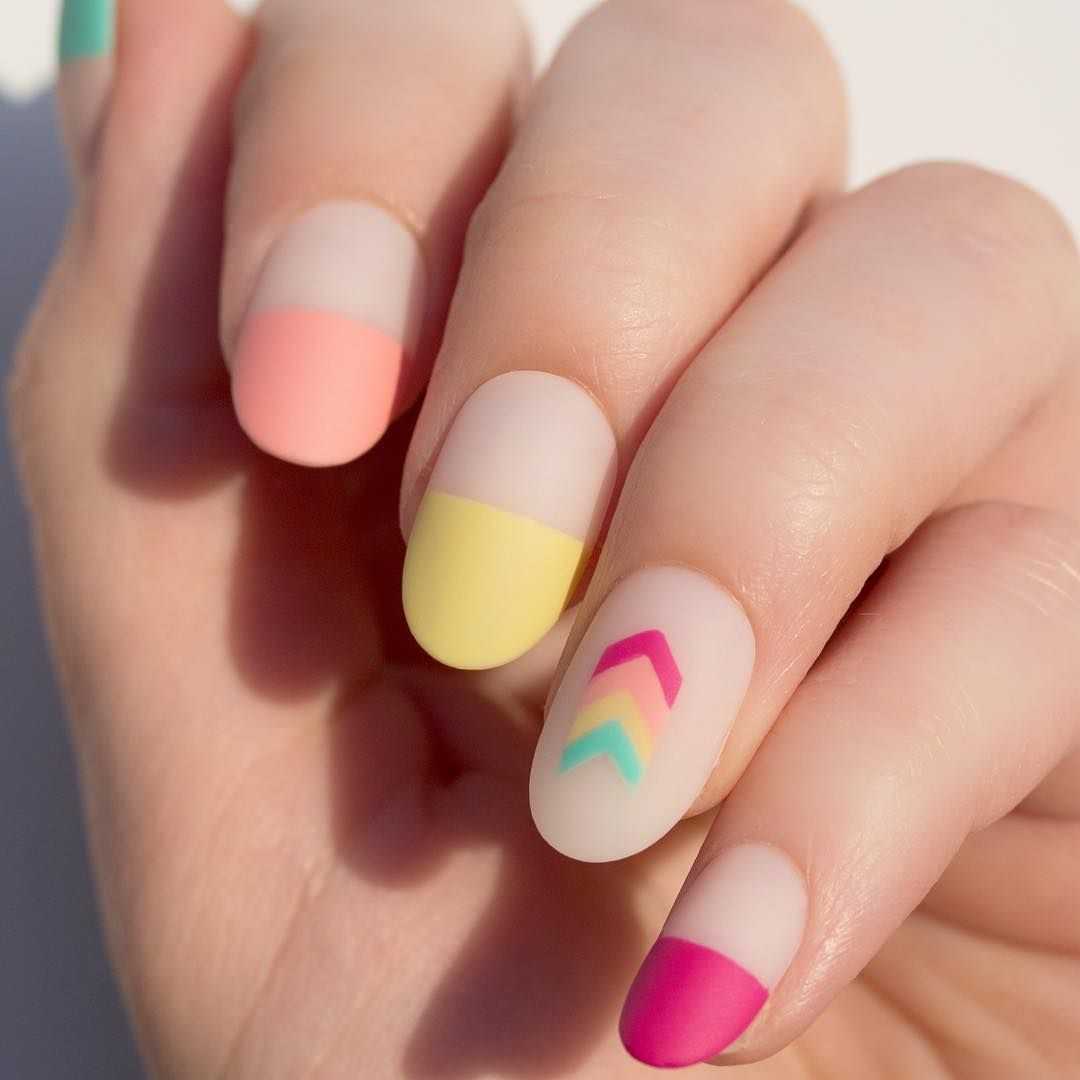 Кроме того матовые нейл-арты отлично смотрятся в любом цвете и любыми видами декора. Что касается разноцветных дизайнов, то тут можно использовать как яркие оттенки, так и приглушенные.