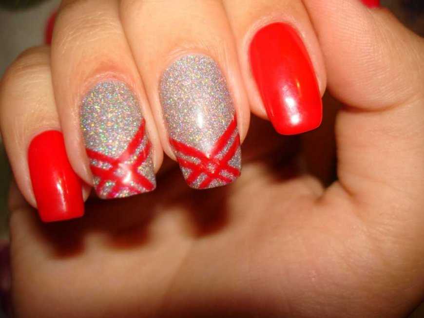 Использовать для декора фольгированный скотч нужно правильно. Нежелательно оформлять им все ногти рук: достаточно четырех из десяти пальцев и буквально по две полоски на дизайн, будь то параллельные или пересекающиеся прямые.