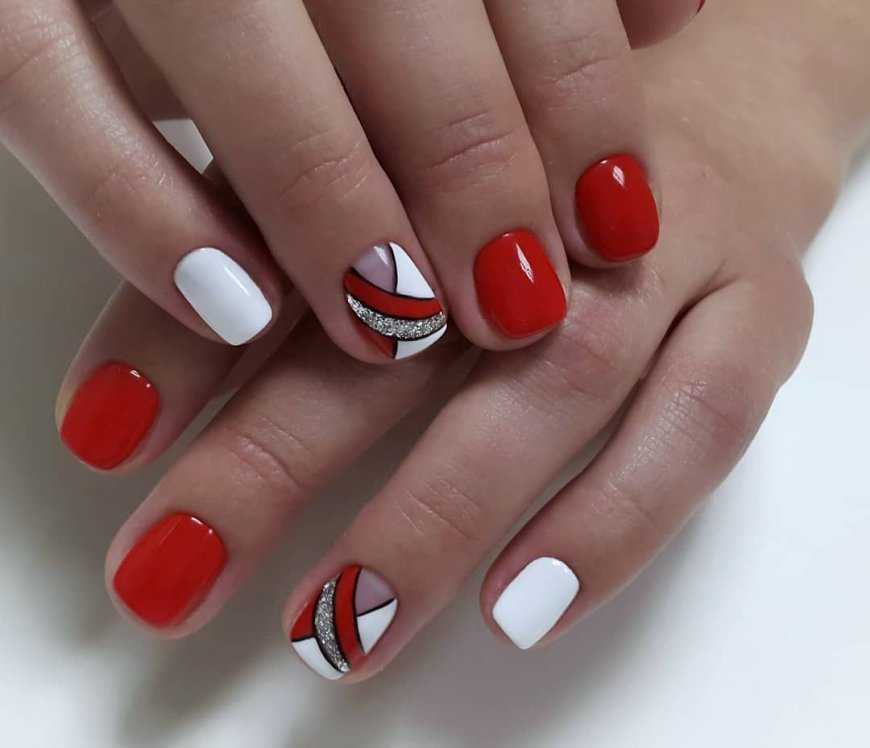 Красный – это универсальный цвет. Его можно наносить в сочетании с другими цветами (особенно красивые сочетания – это золотой, белый либо черный), хорошо смотрится с рисунками. Популярные остаются матированные покрытия. Хорошо сочетается с эффектом омбре, с красиво вырисованной геометрией.