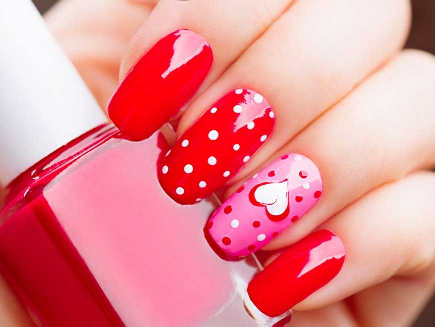 Для начала нужно взять один цвет за основу – накрасьте им все ногти. Изюминку можно сделать только на двух пальчиках – безымянном и среднем. При помощи светлого делаем сердечки на весь ноготок – самая широкая часть должна располагаться возле кутикулы.