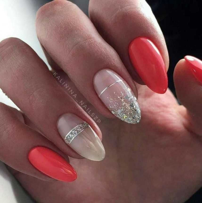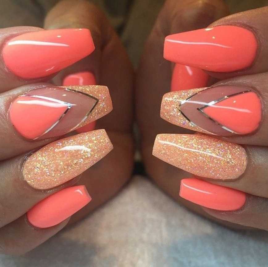 Добавить изысканности коралловому маникюру 2020 помогут блестки. Они являются основой праздничного дизайна, но и для повседневности они подойдут, если их использовать в небольшом количестве. Симпатично смотрятся крупные блестки в виде различных фигурок.