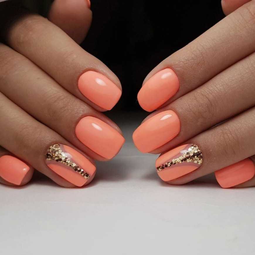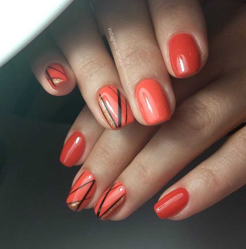 Коралловые ногти с блестящими полосками становятся все более востребованными в ногтевой индустрии. Полоски могут быть золотого или металлического цвета. Актуальный тренд 2018-2019 г. можно выполнить как на коротких, так и на длинных ногтях. В любом случае он будет смотреться эффектно.