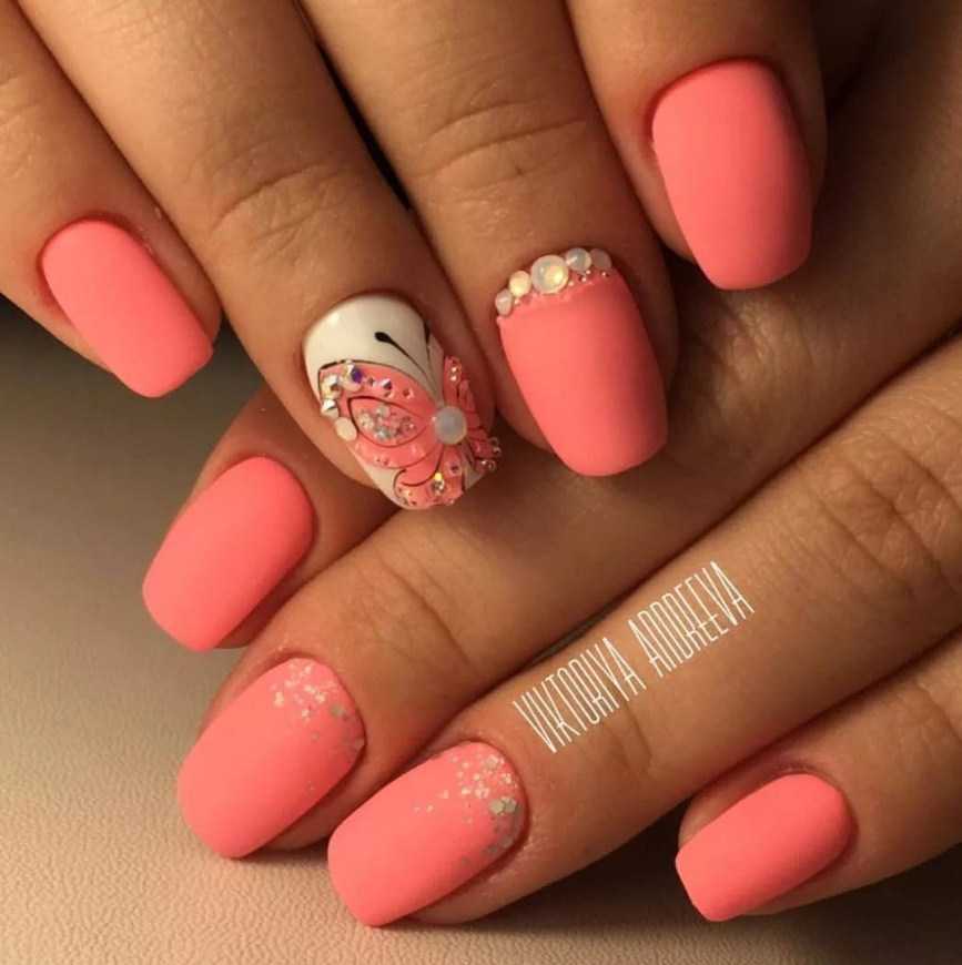 Рисунки насекомых на ноготках никогда не выходят из моды. В 2023 будут актуальными яркие изображения бабочек, выполненные сочными тонами, либо обратная вариация нейл-арта (коралл на светлом фоне).