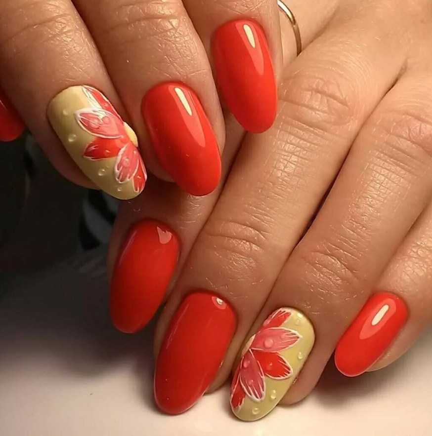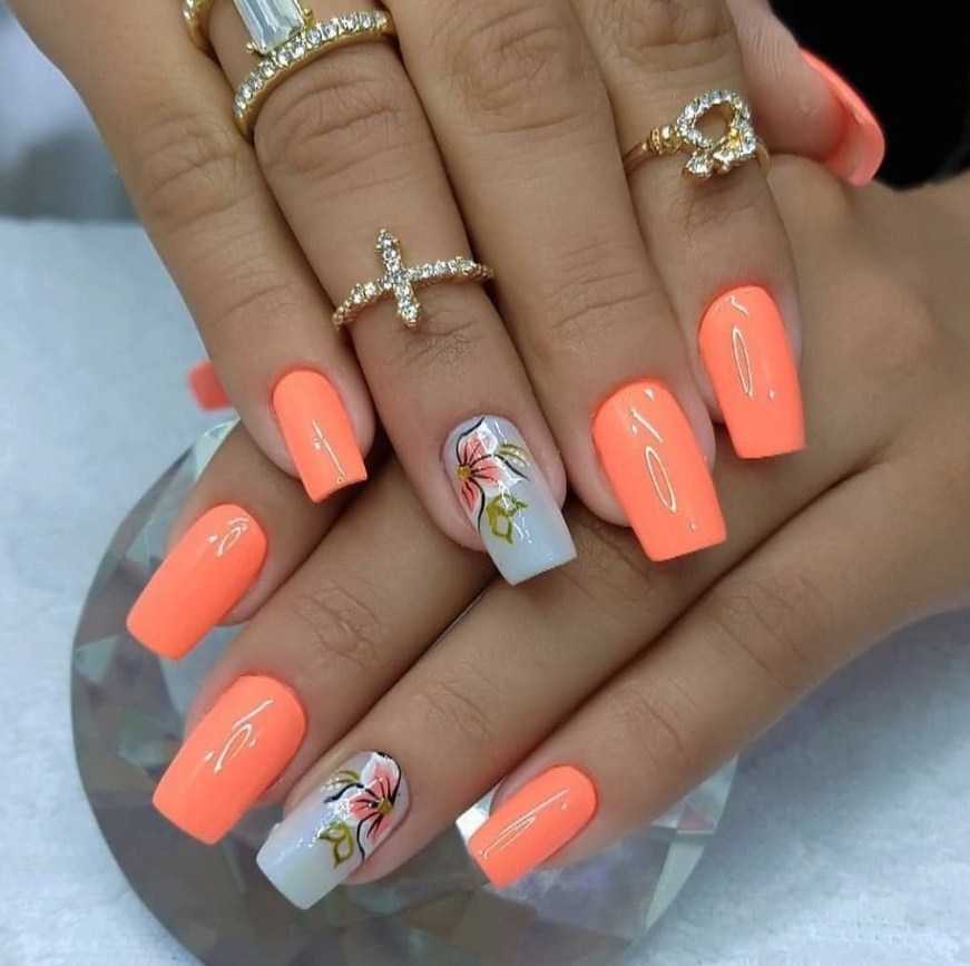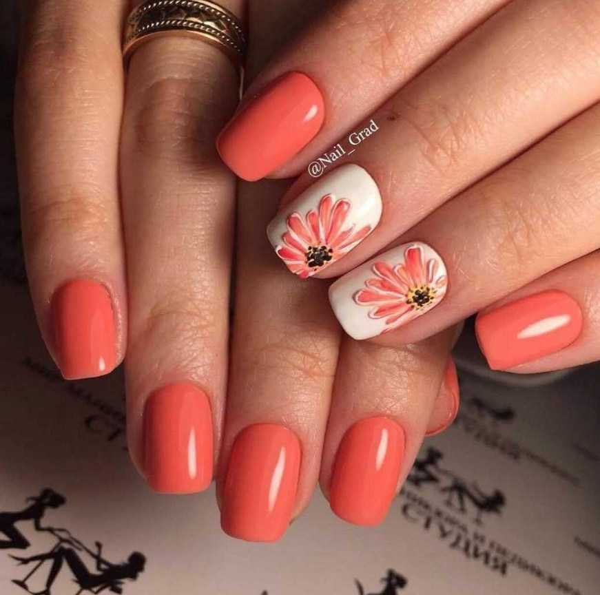 Романтичный вариант на все времена, который можно увидеть в различных интерпретациях. Цветы могут быть крупными или наоборот небольшими, украшать 1-2 пальца. С коралловым лаком отлично сочетаются контрастные мотивы, но если вам хочется окружить себя аурой нежности, то попробуйте нарисовать цветы в акварельной технике. Такой маникюр в коралловых цветах станет прекрасным украшением на длинные и на короткие ногти.