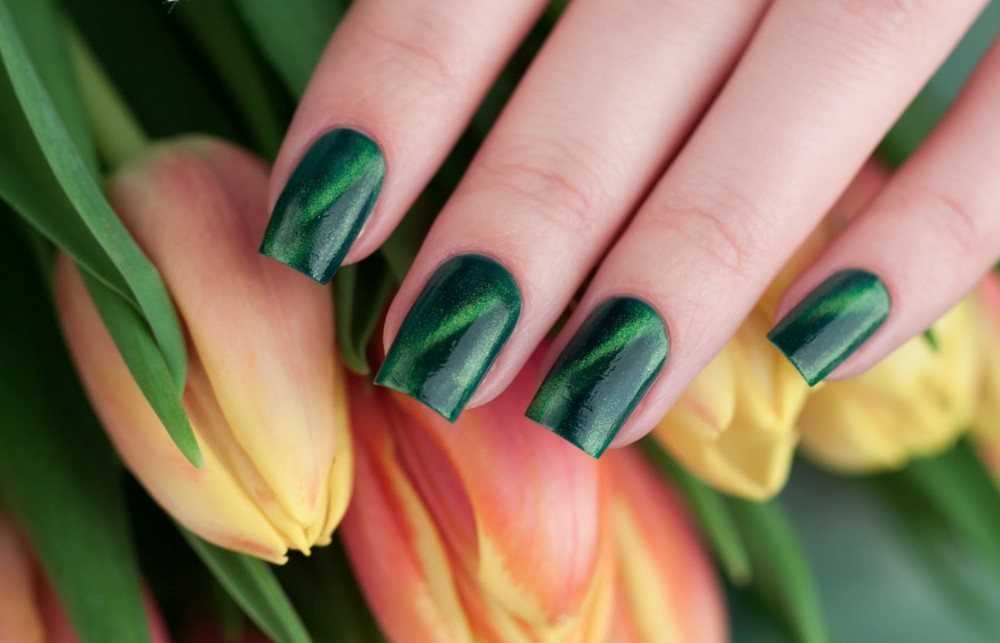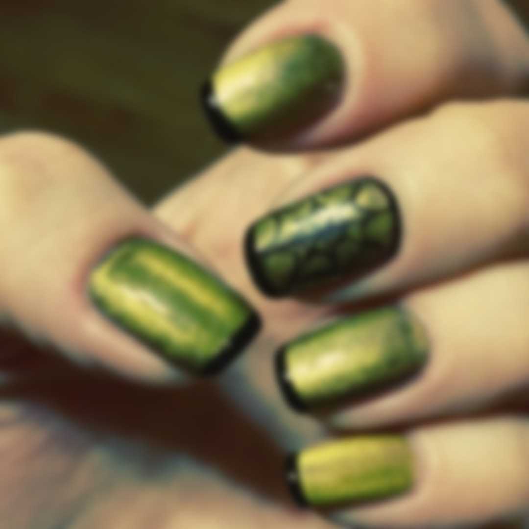 - Маникюр можно создавать с использованием лаков зеленых тонов: малахитовый или болотный эффект.