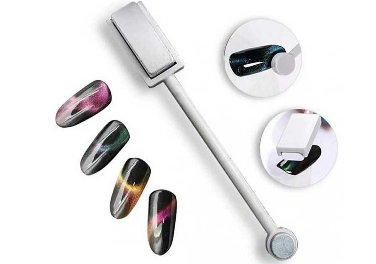 Для создания рисунков выпускают инструменты в виде ручек, брусочков, пластин, полосок, систем из двух съемных элементов на подставке. На пластинах и брусках поверхность делают гладкой для прямого блика или узорчатой (полоски, сетки, звездочки), которая дает вариации переливов. Их подносят разными сторонами к ногтям, получая интересные формы оптического эффекта. От мощности магнита зависит скорость появления нужного рисунка и качество дизайна.