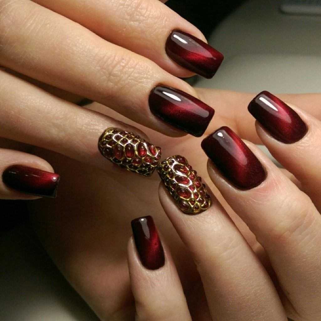 Необычная техника разнообразит цвет и придаст классическому красному сияния. Он хорош для женщин разных возрастов. В качестве украшения лучшими вариантами станут жидкие камни и фольга. Можно поэкспериментировать и сделать, например, френч – получится оригинально и празднично. Для коротких ногтей очень хорошо подойдет матовое покрытие.