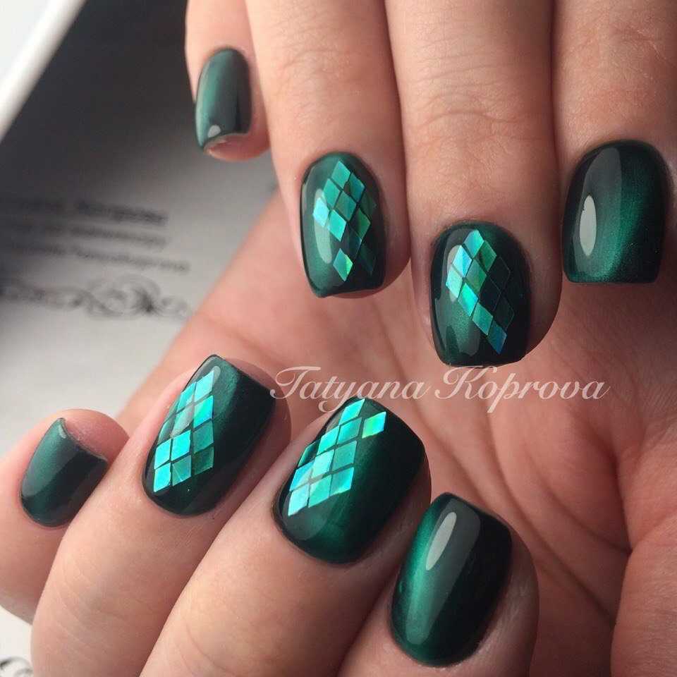 Стильный и волнующий изумрудный годится на разную длину ногтей. Для декорирования такого самодостаточного цвета подойдут стразы или же простая полоса золотого цвета. Такие элементы декора не перекроют красоту и глубину зеленого.