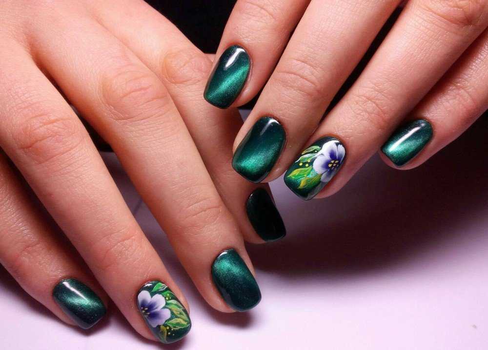 Основой под цветы из акрила или вырисованные гель-лаком, ложится гель-лак кошачий глаз, а сверху уже прорисовывают или «расцветают» цветы любых форм, размеров и оттенков. Здесь, точно так же, как и в случае со стразами, главное не переборщить.
