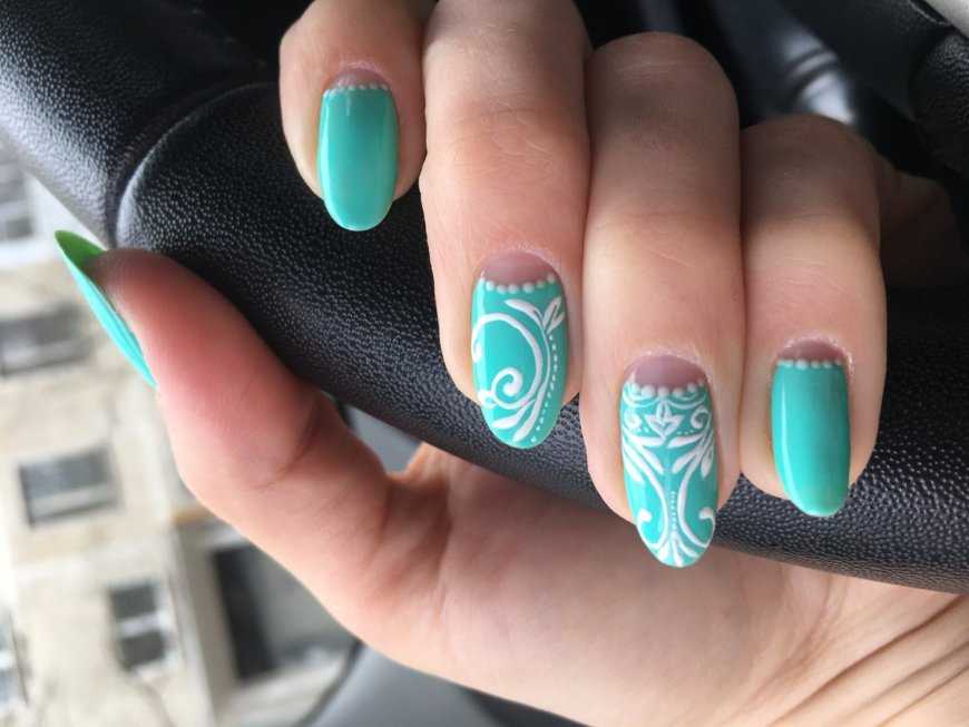 Бирюзовый цвет — потрясающая основа для дизайнерского маникюра. Он сочетается со многими цветами, довольно сдержанный, но благородный.