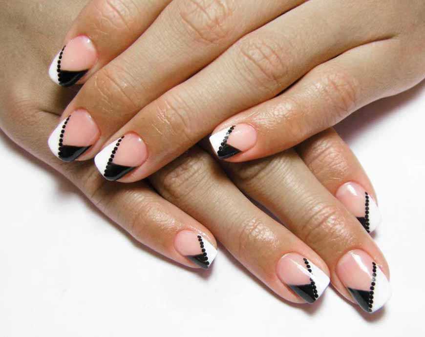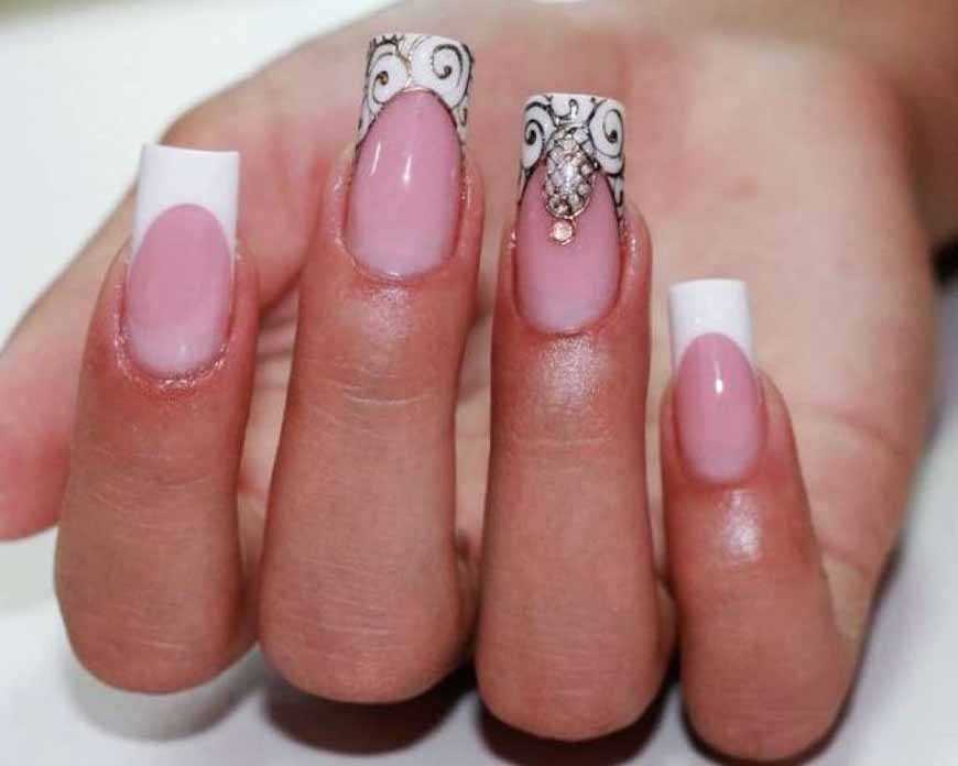 Также на внешний вид маникюра влияет украшение ногтей. В качестве дополнительного декора могут применяться бульонки, камешки, стразы и блестки. Черно-белый френч маникюр – это вид маникюра, дающий возможность экспериментировать и сочетать сразу несколько цветов. Черно-белая цветовая палитра представляет собой одно из удачных примеров.
