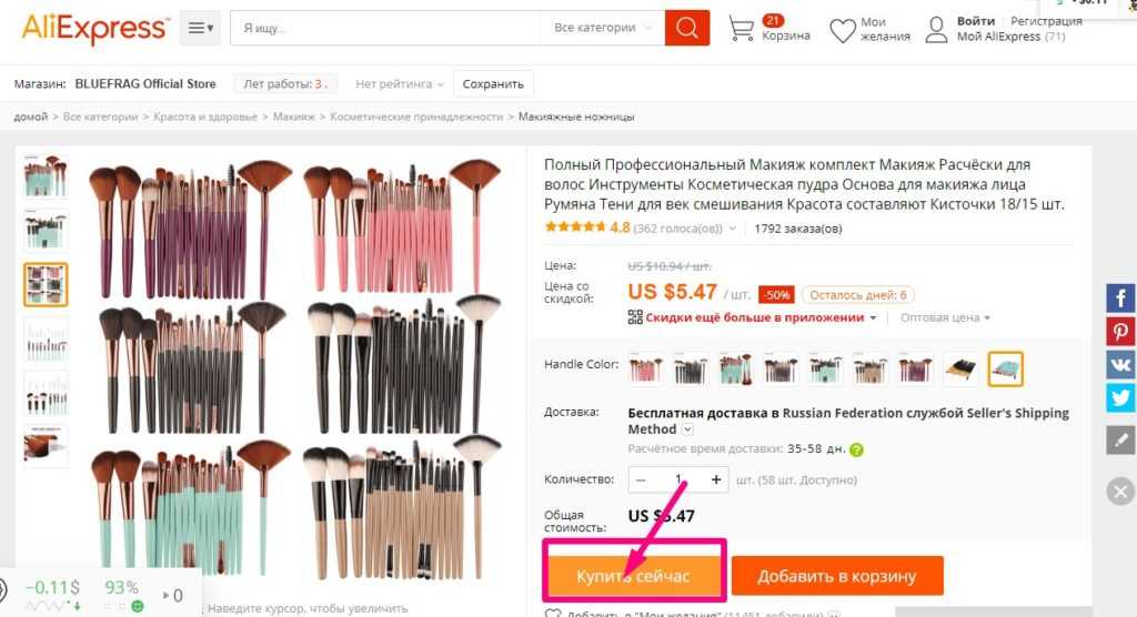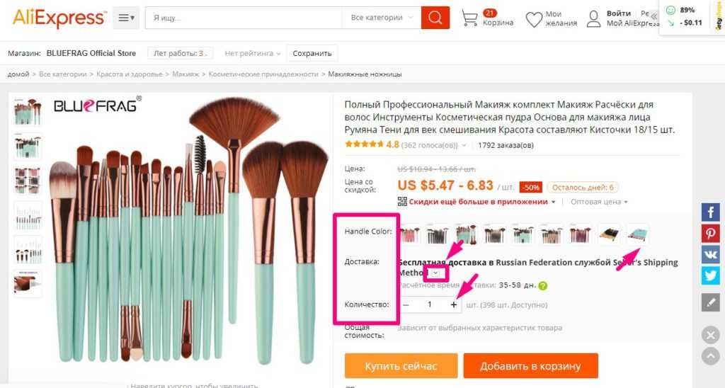 2. Откроем карточку товара. К примеру, описание комплекта профессиональных кистей для мейкапа. Оформим детали покупки. Укажем цвет держателей, количество наборов, которые хотим купить.
