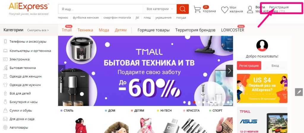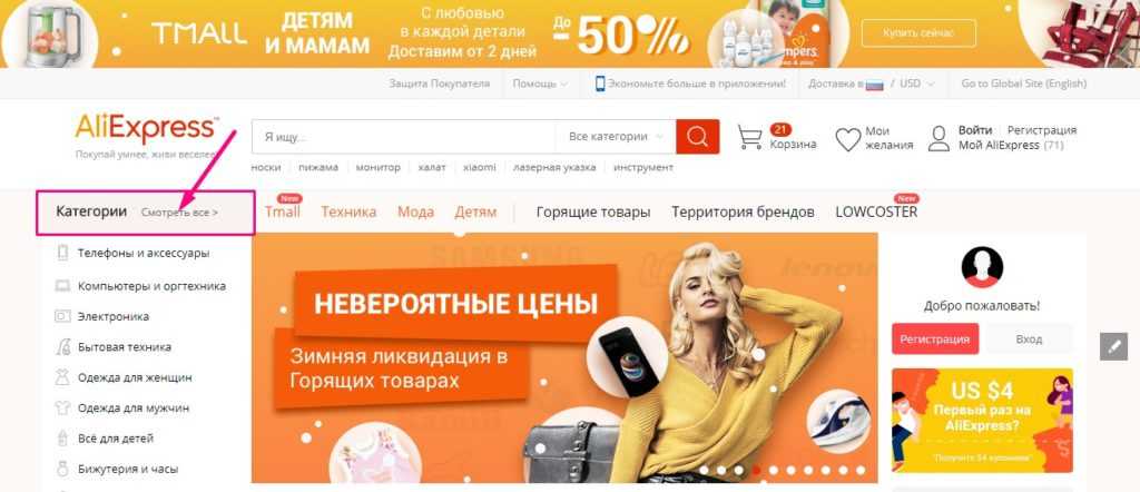1. Зайдем на стартовую ресурса. Над списком категорий товаров кликнем «Смотреть все».
