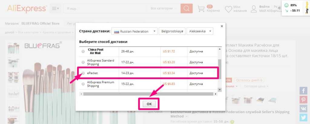 3. В строке «Доставка» указан способ отправки заказа по умолчанию. Ниже — ориентировочные сроки получения. Если условия устраивают, продолжим оформление покупки. Для выбора другого способа отправки нажмем стрелку в конце строки и сменим настройку в открывшейся таблице. Подтвердим выбор клавишей «Ok».