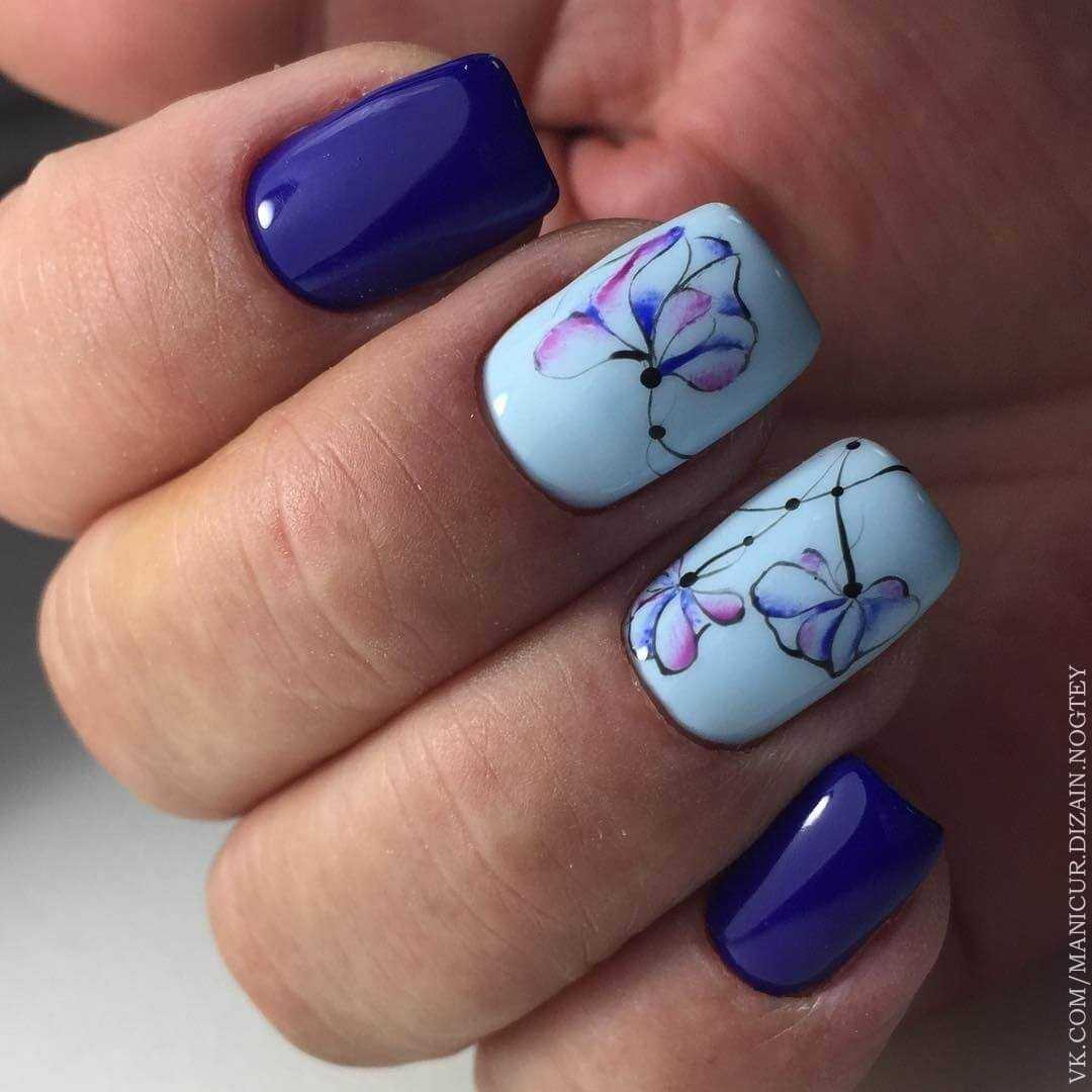 Синий маникюр на коротких ногтях можно дополнить лаконичным дизайном. Недопустимо, чтобы они были слишком большими и слишком вычурными. Также подойдут цветочные мотивы, веточки, шишки, животные орнаменты. Маникюр, содержащий геометрические и абстрактные элементы, элегантно смотрится на коротких пластинах.