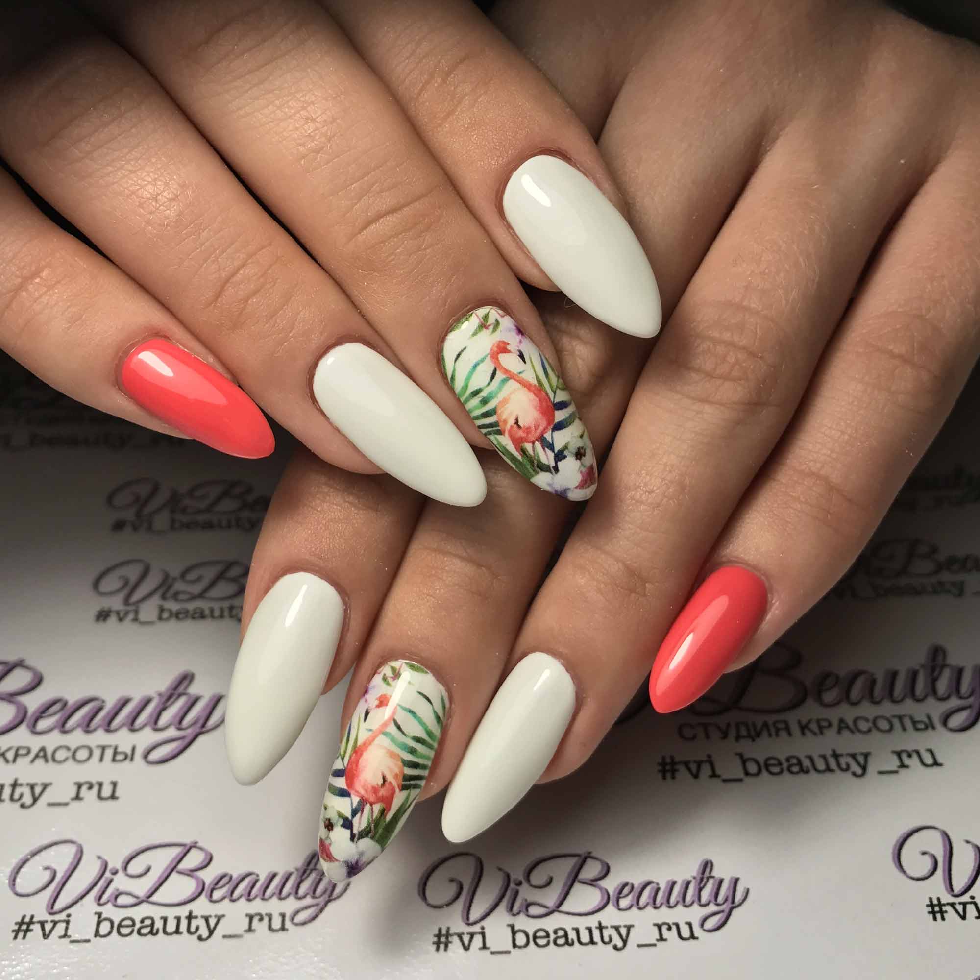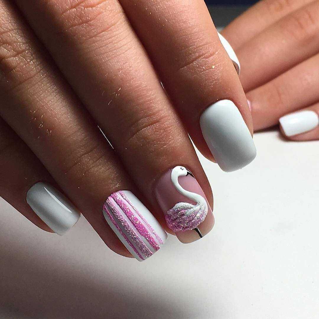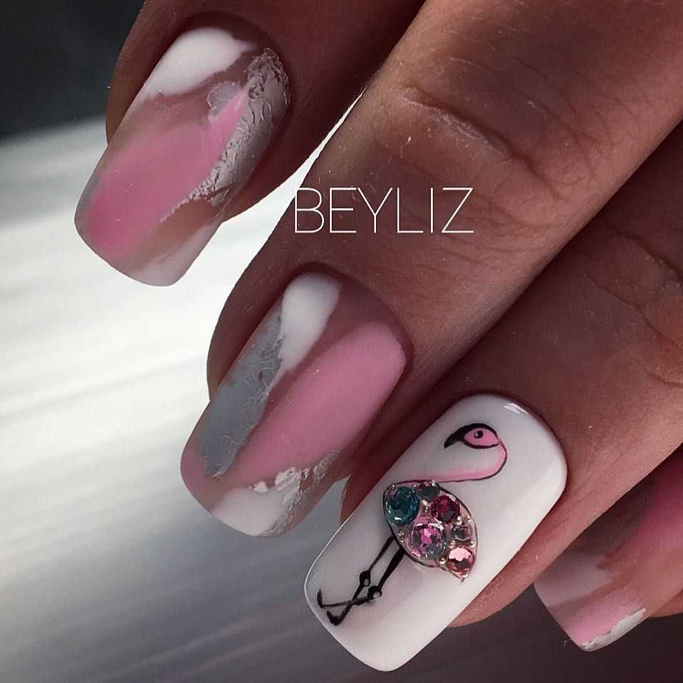 Если вы любите белый цвет, почему бы вам не использовать его в маникюре с фламинго? Чтобы нейл-арт не выглядел скучным, вы всегда его можете разбавить такими техниками, как френч, лунный или французский, омбре или negative space. А вот добавить очарования вашим ручкам поможет декор. Например, вы всегда можете попробовать беспроигрышное сочетание белого маникюра, рисунка фламинго и страз, фольги, скот-ленты, глиттера или бусин.